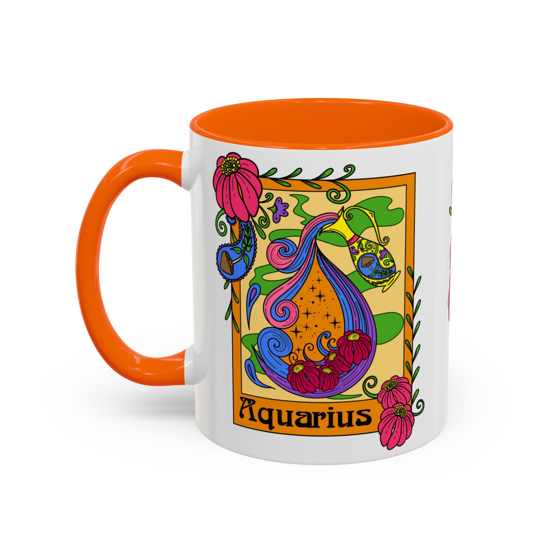 Aquarius star sign astrology coffee mug with bold retro colourful design, perfect as a birthday gift for astrology enthusiasts. This mug is microwave and dishwasher safe, with vibrant retro colours. It features a white ceramic body with coloured interior and handle, making it an eye-catching addition to your morning routine. Ideal for those who love astrology and horoscopes, suitable for birthdays and special occasions.