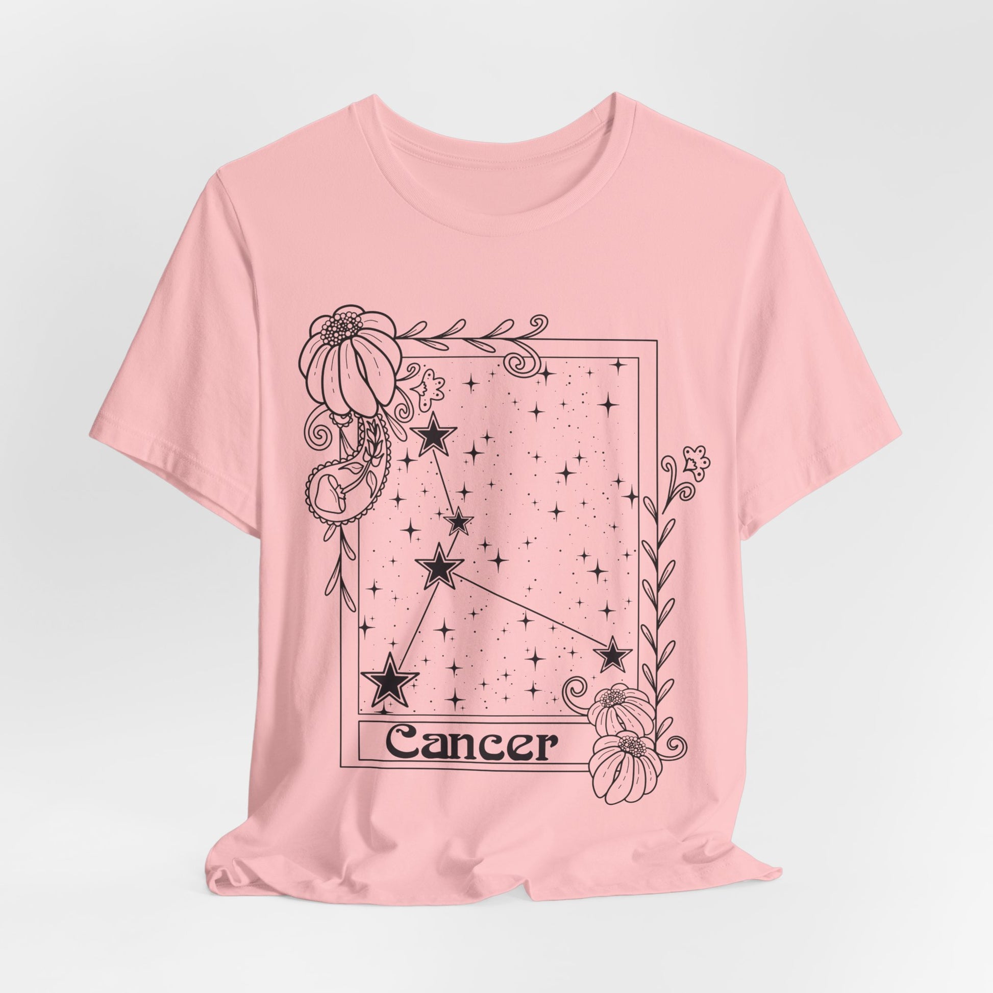 Introducing a celestial and artistic unisex lightweight short sleeve T-shirt that embodies creativity and individuality. This shirt features an eye-catching design inspired by the Cancer zodiac, adorned with the constellations and floral elements that bring a touch of whimsy and personality to your wardrobe. Perfect for casual outings or relaxed gatherings, this tee offers versatility, making it suitable for layering or wearing on its own. Ideal for astrology enthusiasts and those who love unique fashion statements, this shirt embraces self-expression and joy. Celebrate birthdays, zodiac-themed events, or simply add a splash of fun to your everyday look with this lively piece! Product features - Made with 100% Airlume combed and ring-spun cotton for breathability and comfort - Ribbed knit collar retains its shape and adds a classic touch - Side seams provide structural support for a lasting fit - Vibrant printing techniques ensure detailed designs and smooth finishes - Tear-away label minimizes skin irritations, enhancing comfort firsthand. Care instructions - Machine wash: cold (max 30C or 90F) - Non-chlorine: bleach as needed - Tumble dry: low heat - Iron, steam or dry: medium heat - Do not dryclean