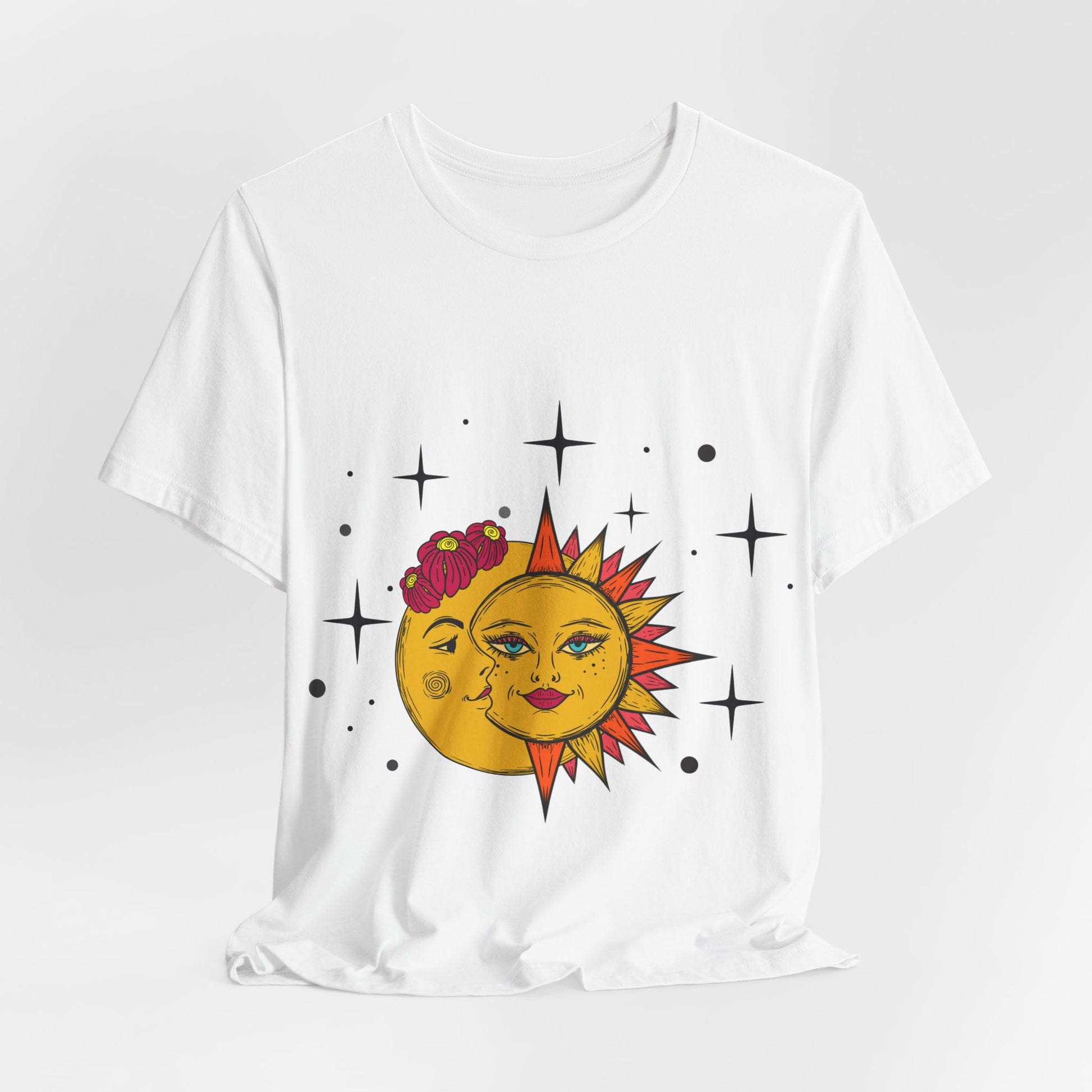 This celestial sun and moon t-shirt has a boho style with stars, giving off a mystical and whimsical vibe. Perfect for those who love astrology and nature-inspired designs, this t-shirt is great for casual wear and can be easily layered. Ideal for adults, this t-shirt is made with lightweight, breathable fabric and has a retail fit suitable for various settings. It is a great addition to your wardrobe for holidays, festivals, or everyday wear.