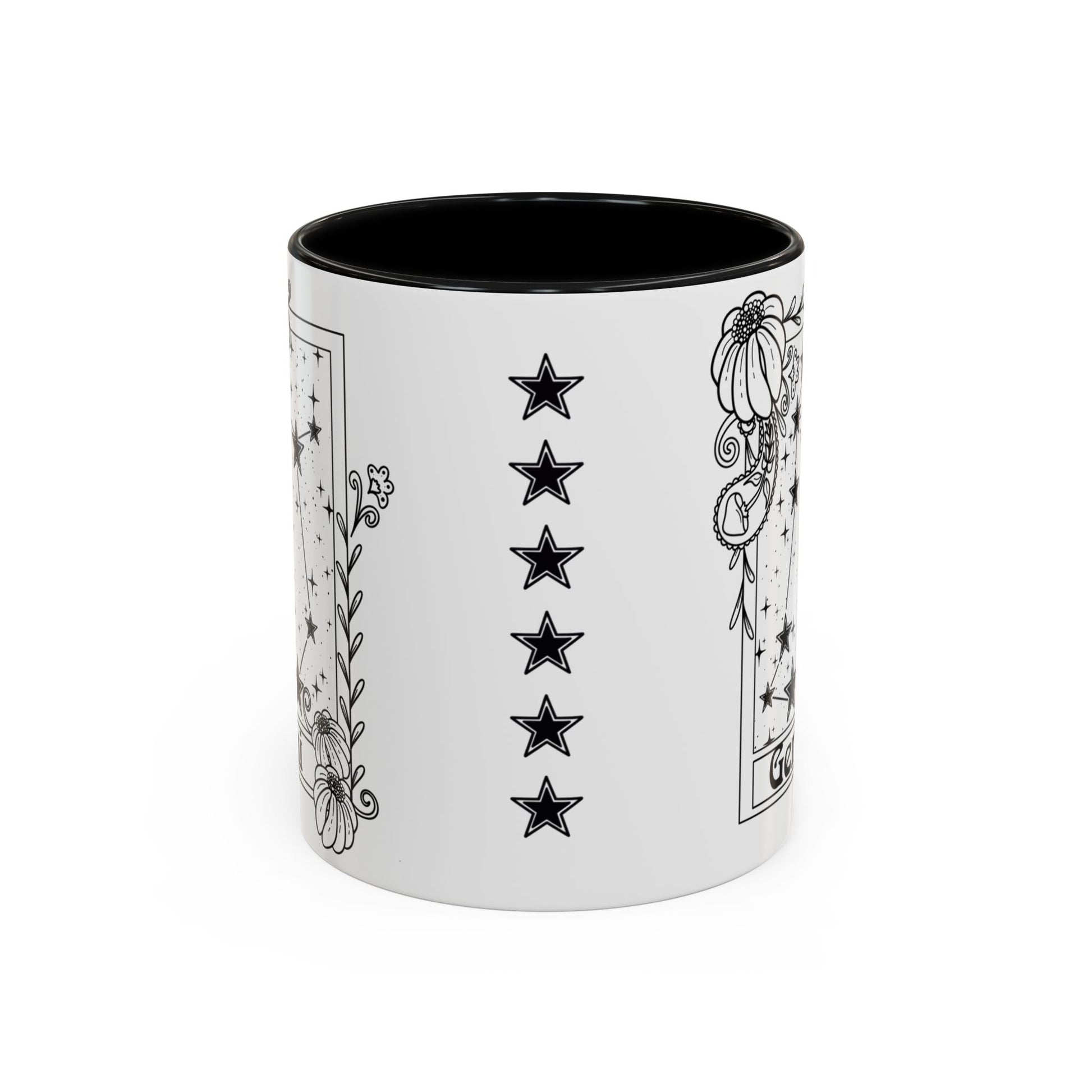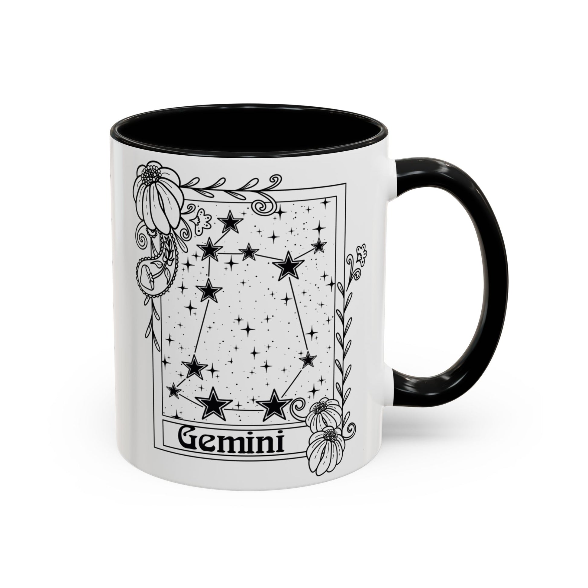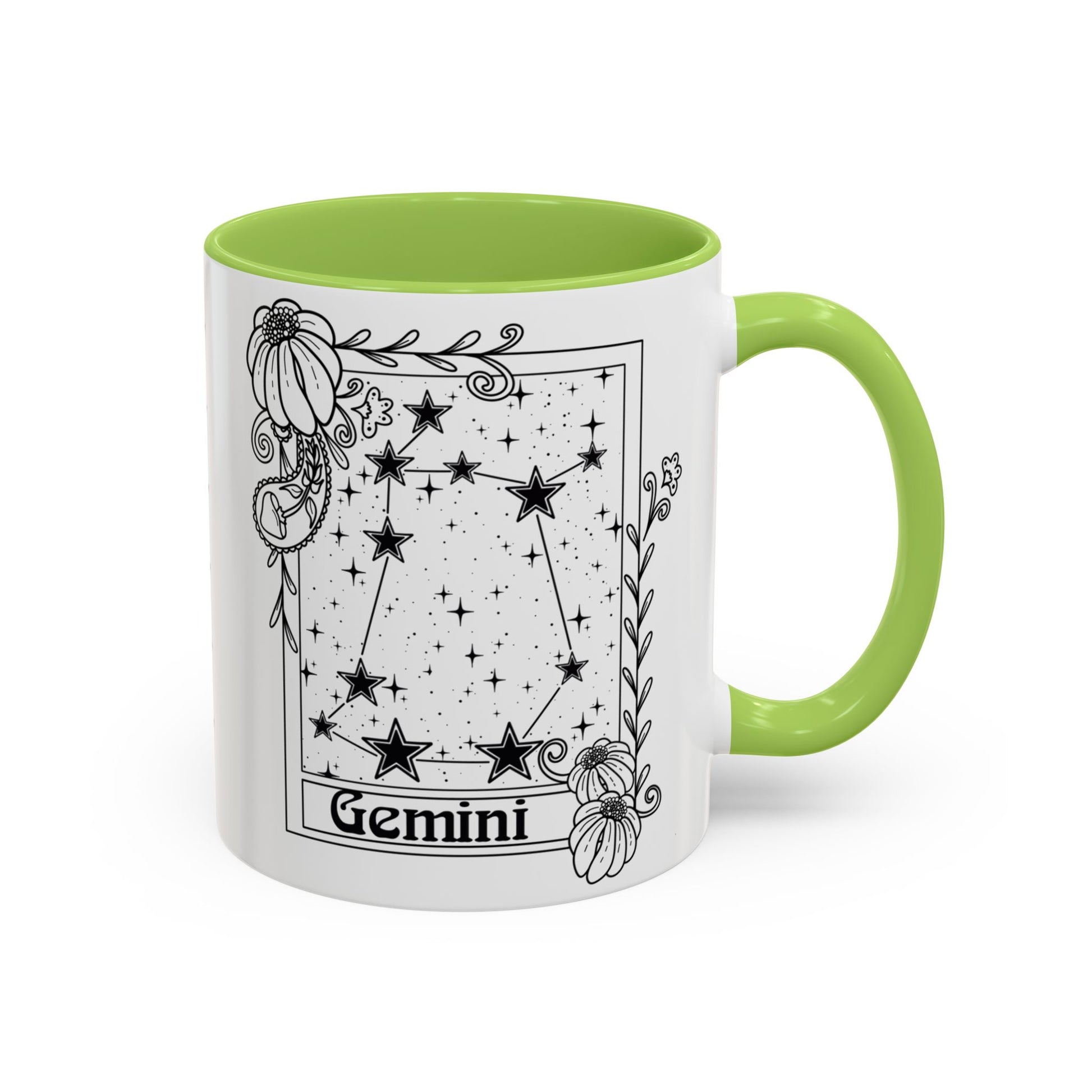 Gemini star sign astrology coffee mug with whimsical constellation star design, perfect as a birthday gift for astrology enthusiasts. This mug is microwave and dishwasher safe, with a floral zodiac design. It features a white ceramic body with coloured interior and handle, making it an eye-catching addition to your morning routine. Ideal for those who love astrology and horoscopes, suitable for birthdays and special occasions.