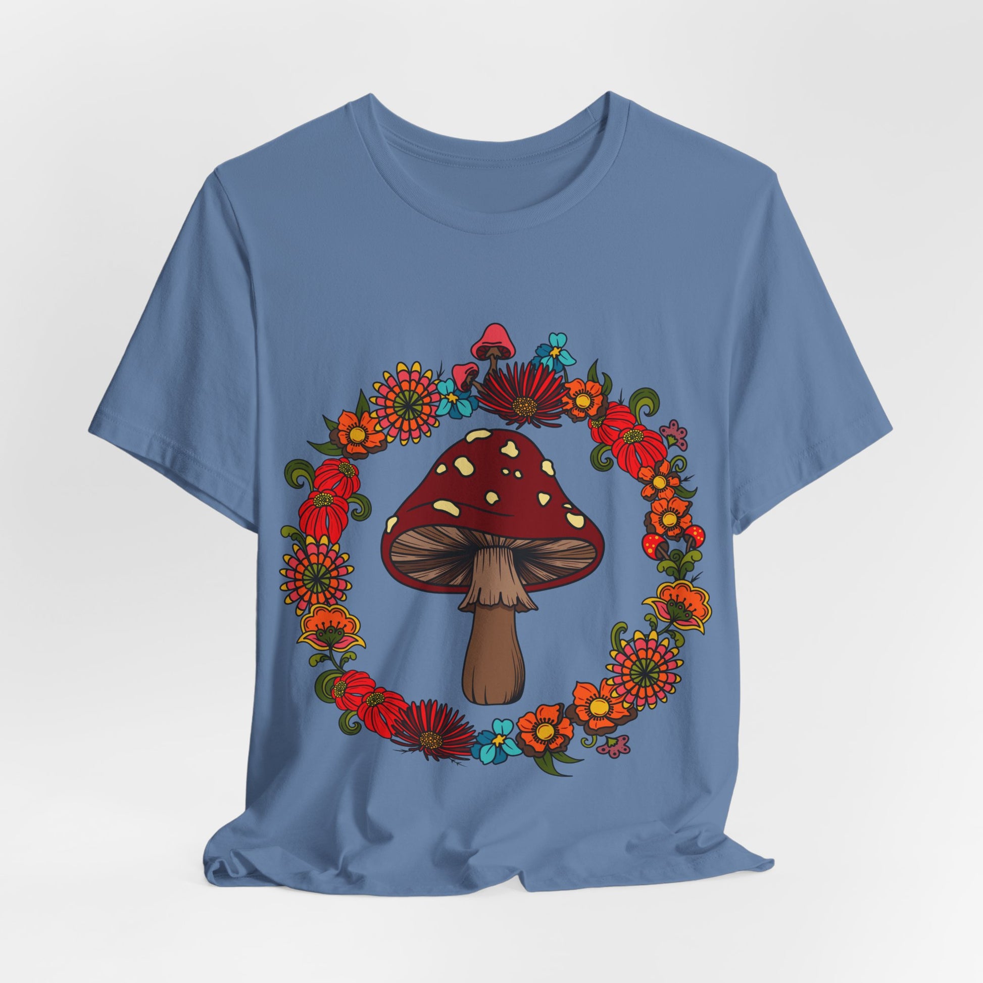 This Hippie Floral mushroom t-shirt captures the boho 1960s 1970s style, perfect for festivals and a free-spirited vibe. It's made with 100% Airlume combed and ring-spun cotton, making it lightweight and breathable, ideal for active and leisure wear. The retail fit and classic crew neckline make it versatile for casual and semi-formal settings, perfect for those who love retro fashion and nature-inspired designs. Ideal for summer music festivals, Earth Day celebrations, and casual everyday wear.
