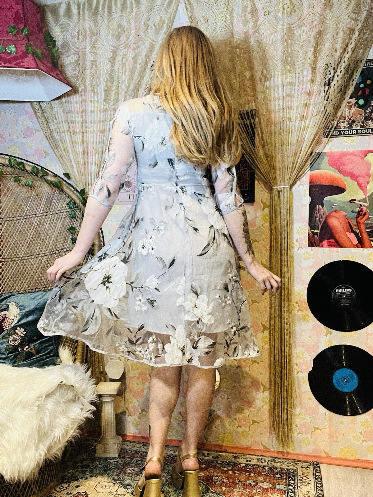 This Gorgeous summer dress is designed for women in a size 10, featuring a beautiful floral pattern in shades of grey. The dress has a stylish A-line silhouette with a knee-length cut, perfect for a special event like a christening , wedding or prom. It has sheer sleeves and a floaty overlay, adding a layered look for added sophistication. Ideal for the summer season, this dress exudes a feminine and elegant vibe, making it a versatile and chic addition to any wardrobe.