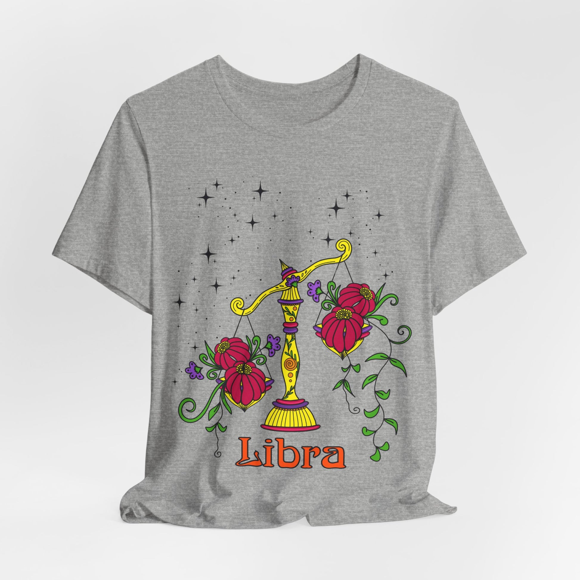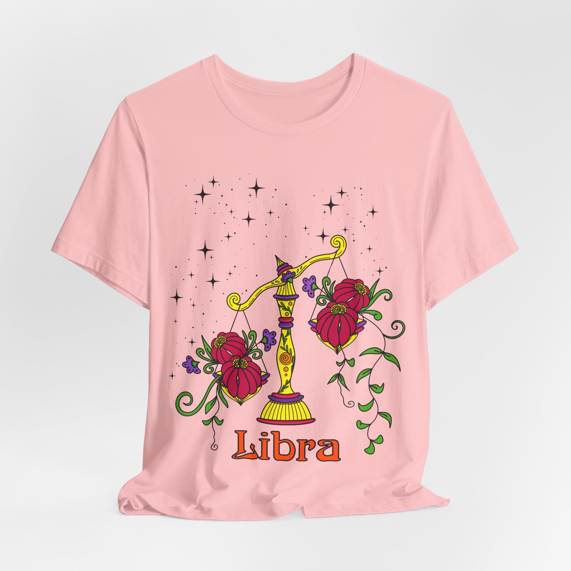 Introducing a vibrant and artistic unisex lightweight short sleeve T-shirt that embodies creativity and individuality. This shirt features an eye-catching design inspired by the Libra zodiac, adorned with colourful scales and floral elements that bring a touch of whimsy and personality to your wardrobe. Perfect for casual outings or relaxed gatherings, this tee offers versatility, making it suitable for layering or wearing on its own. Ideal for astrology enthusiasts and those who love unique fashion statements, this shirt embraces self-expression and joy. Celebrate birthdays, zodiac-themed events, or simply add a splash of color to your everyday look with this lively piece! Product features - Made with 100% Airlume combed and ring-spun cotton for breathability and comfort - Ribbed knit collar retains its shape and adds a classic touch - Side seams provide structural support for a lasting fit - Vibrant printing techniques ensure detailed designs and smooth finishes - Tear-away label minimizes skin irritations, enhancing comfort firsthand. Care instructions - Machine wash: cold (max 30C or 90F) - Non-chlorine: bleach as needed - Tumble dry: low heat - Iron, steam or dry: medium heat - Do not dryclean