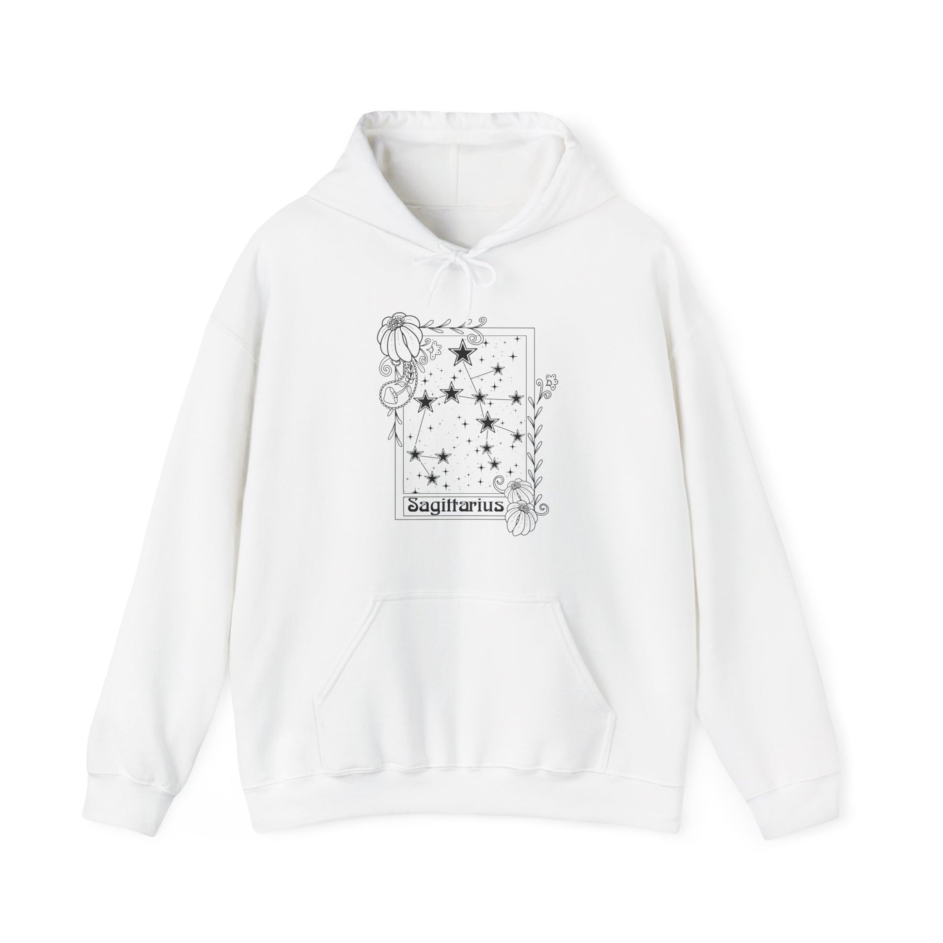 Stay cozy and stylish with this unisex heavy blend hooded sweatshirt. Crafted from a soft, durable material, this sweatshirt is perfect for chilly days or relaxed nights in. With a whimsical Sagittarius constellation design, it adds a unique flair to your wardrobe, making it an excellent choice for astrology enthusiasts. The kangaroo pouch pocket is great for keeping your hands warm or storing essentials while on the go, allowing for both functionality and comfort in your daily life. Ideal for casual outings, holidays, or cozy nights at home, this sweatshirt makes a thoughtful gift for birthdays, holidays, or just because anyone who loves fashion and astrology will appreciate it. Wear it to celebrate Zodiac-themed parties or just lounge around, embodying a mix of style and warmth. Product features - Spacious kangaroo pouch pocket for warmth and storage - Adjustable drawstring hood for a tailored fit - Seamless tubular knit design reduces waste and enhances appeal - Durable fabric blend of 50% cotton and 50% polyester for smooth comfort - Embroidery options available for a personalized touch. Care instructions - Tumble dry: medium - Iron, steam or dry: low heat - Do not dryclean - Machine wash: cold (max 30C or 90F) - Non-chlorine: bleach as needed