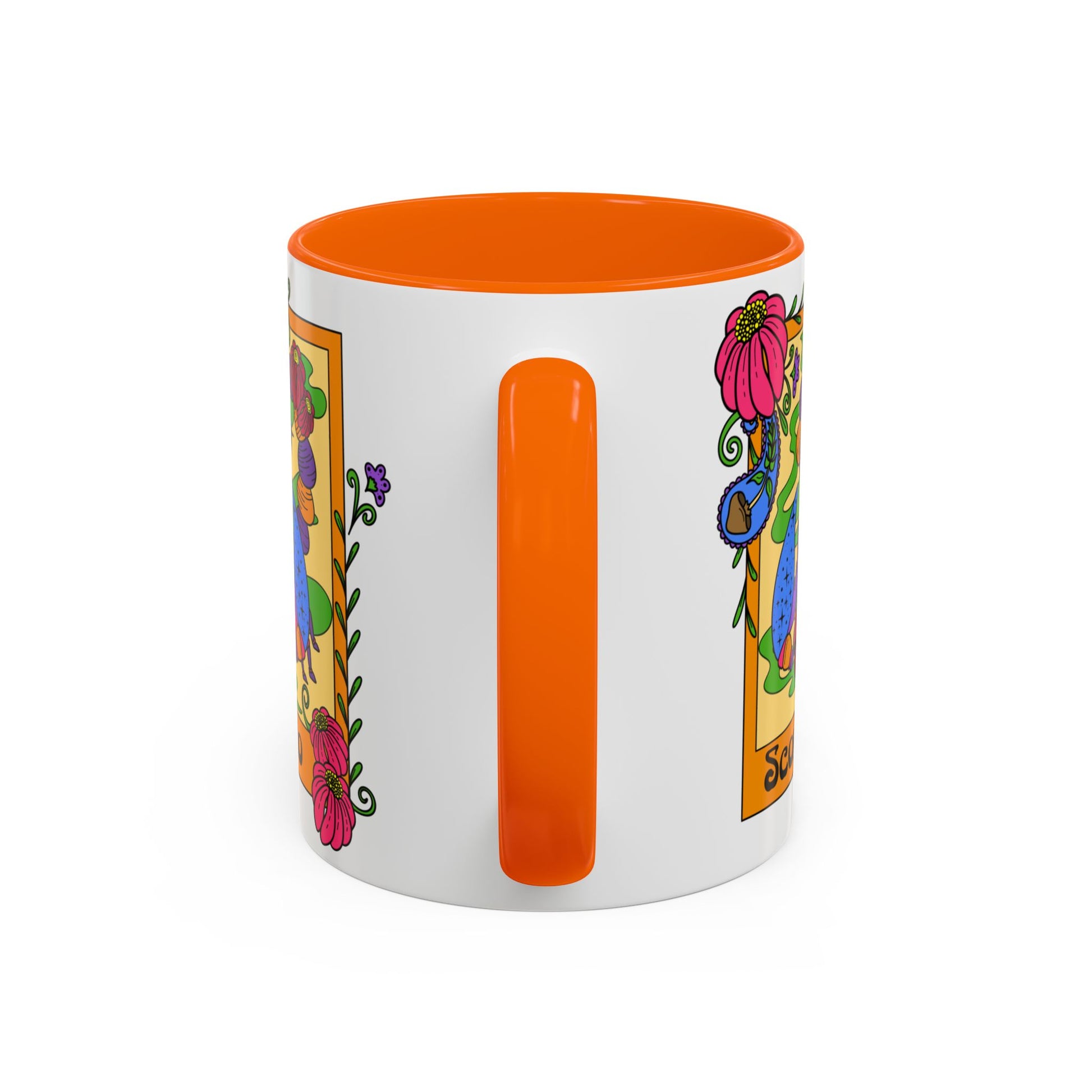Scorpio star sign astrology coffee mug with bold retro colourful design, perfect as a birthday gift for astrology enthusiasts. This mug is microwave and dishwasher safe, with vibrant retro colours. It features a white ceramic body with coloured interior and handle, making it an eye-catching addition to your morning routine. Ideal for those who love astrology and horoscopes, suitable for birthdays and special occasions.