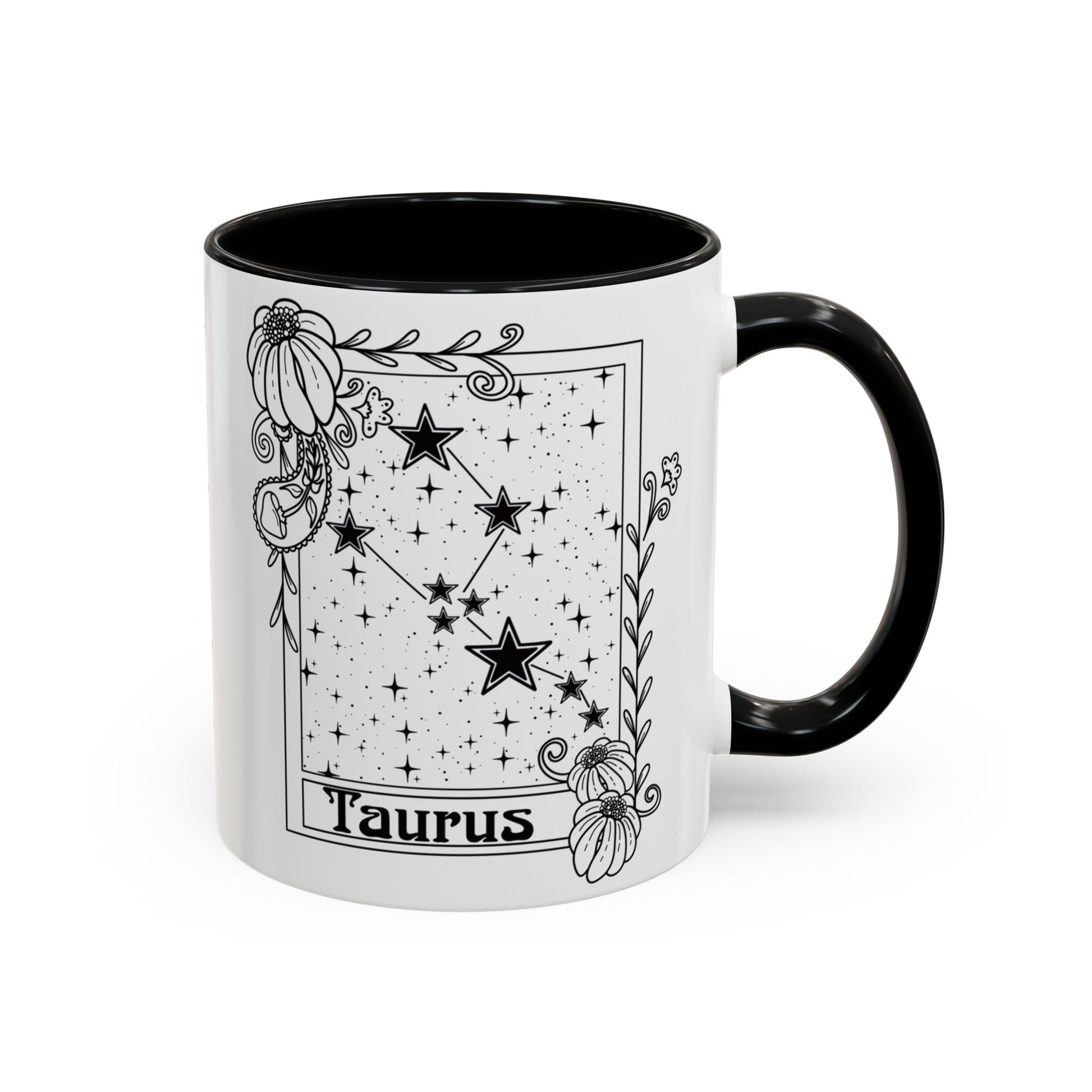 Taurus star sign astrology coffee mug with whimsical constellation star design, perfect as a birthday gift for astrology enthusiasts. This mug is microwave and dishwasher safe, with a floral zodiac design. It features a white ceramic body with coloured interior and handle, making it an eye-catching addition to your morning routine. Ideal for those who love astrology and horoscopes, suitable for birthdays and special occasions.