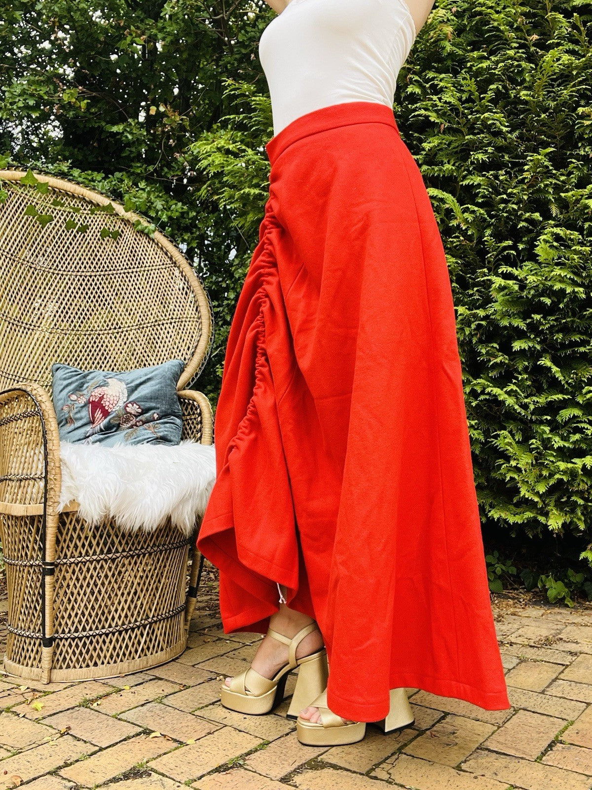 This vintage 1960s maxi skirt features a high waist and a long length with a drawstring ruffle detail, making it a stylish and versatile addition to any wardrobe. The bold red colour adds a pop of colour to any outfit, while the retro design harks back to the fashion trends of the 1960s. Perfect for those who appreciate unique and timeless pieces, this skirt can be dressed up or down to suit any occasion.