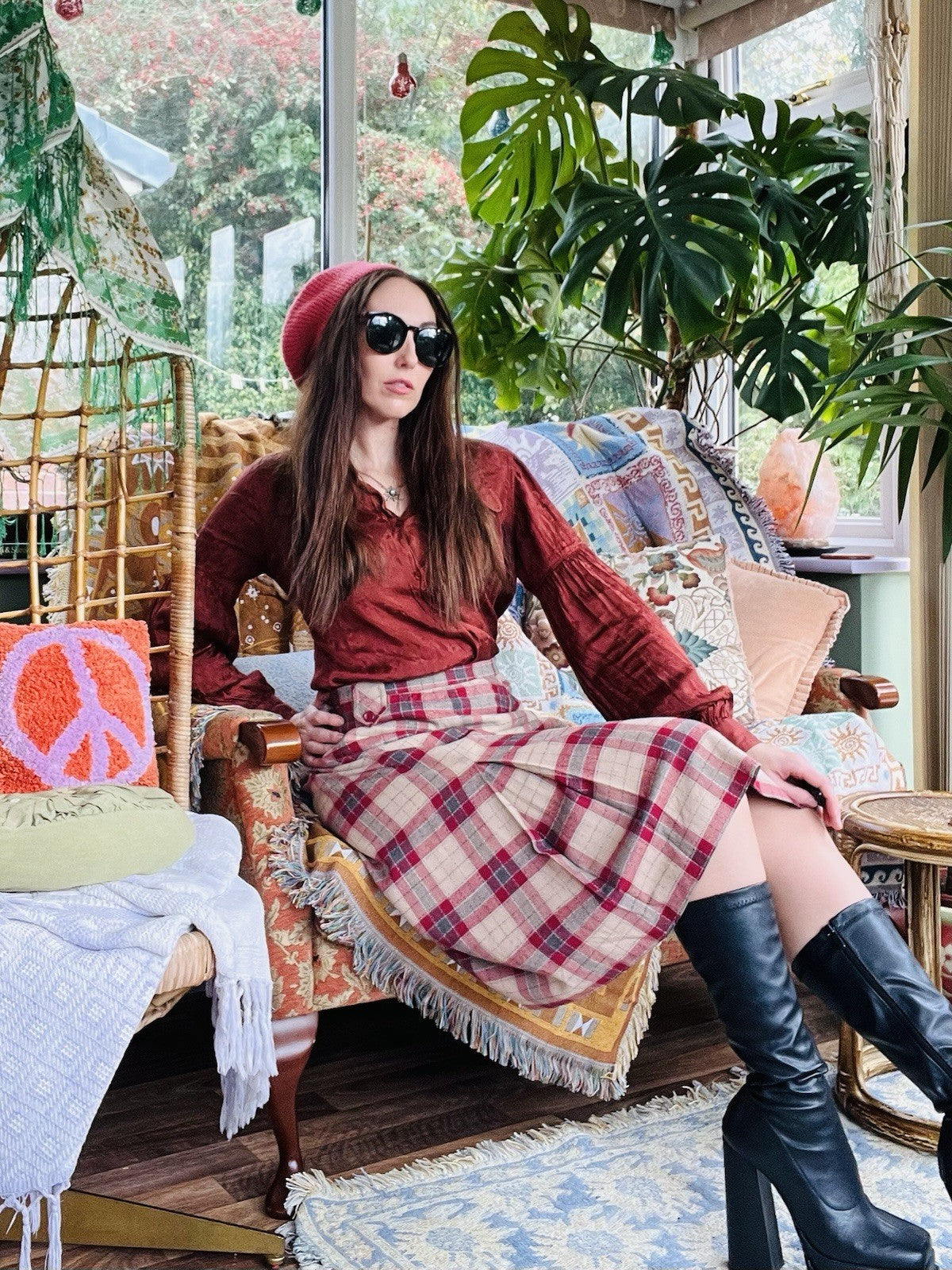 This vintage 1970s Tartan Skirt is a stylish retro piece that embodies the fashion trends of the era. The pleated plaid midi skirt features a high waist, making it a flattering and on-trend option for a size 16 woman. The classic red tartan colour adds a touch of timeless style to any outfit, perfect for those who appreciate classic and unique clothing pieces with a retro twist.