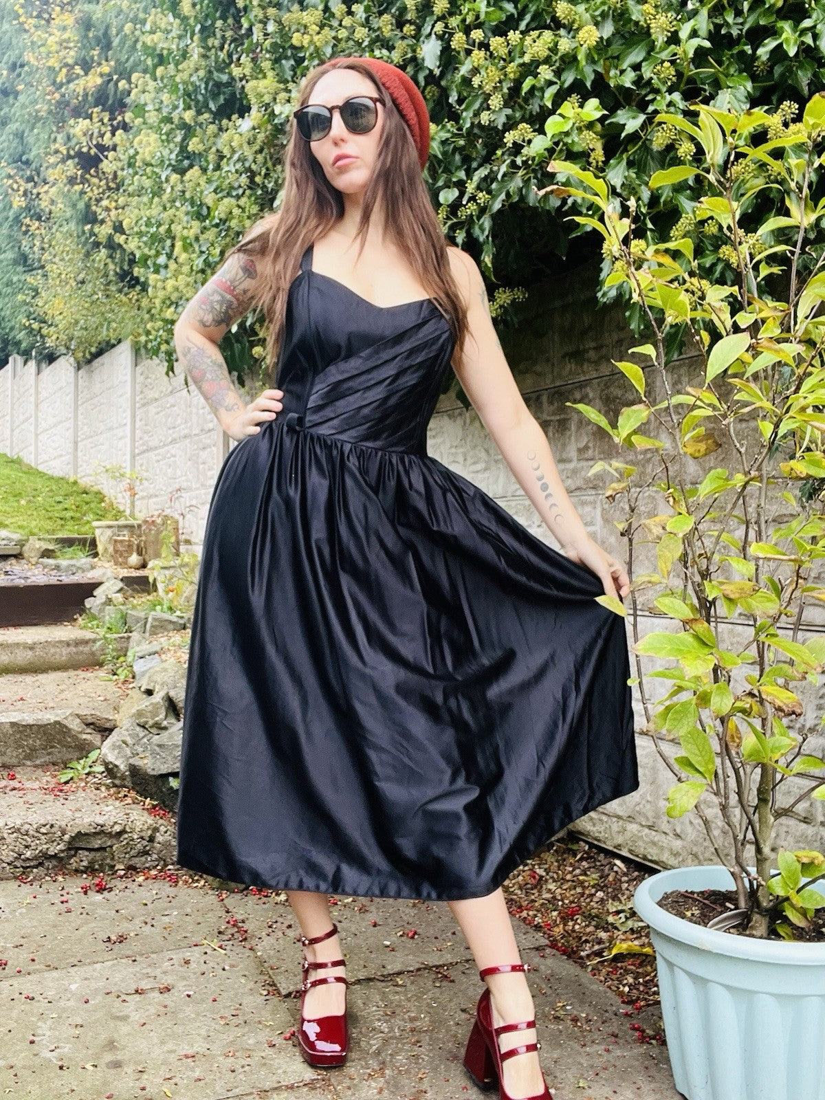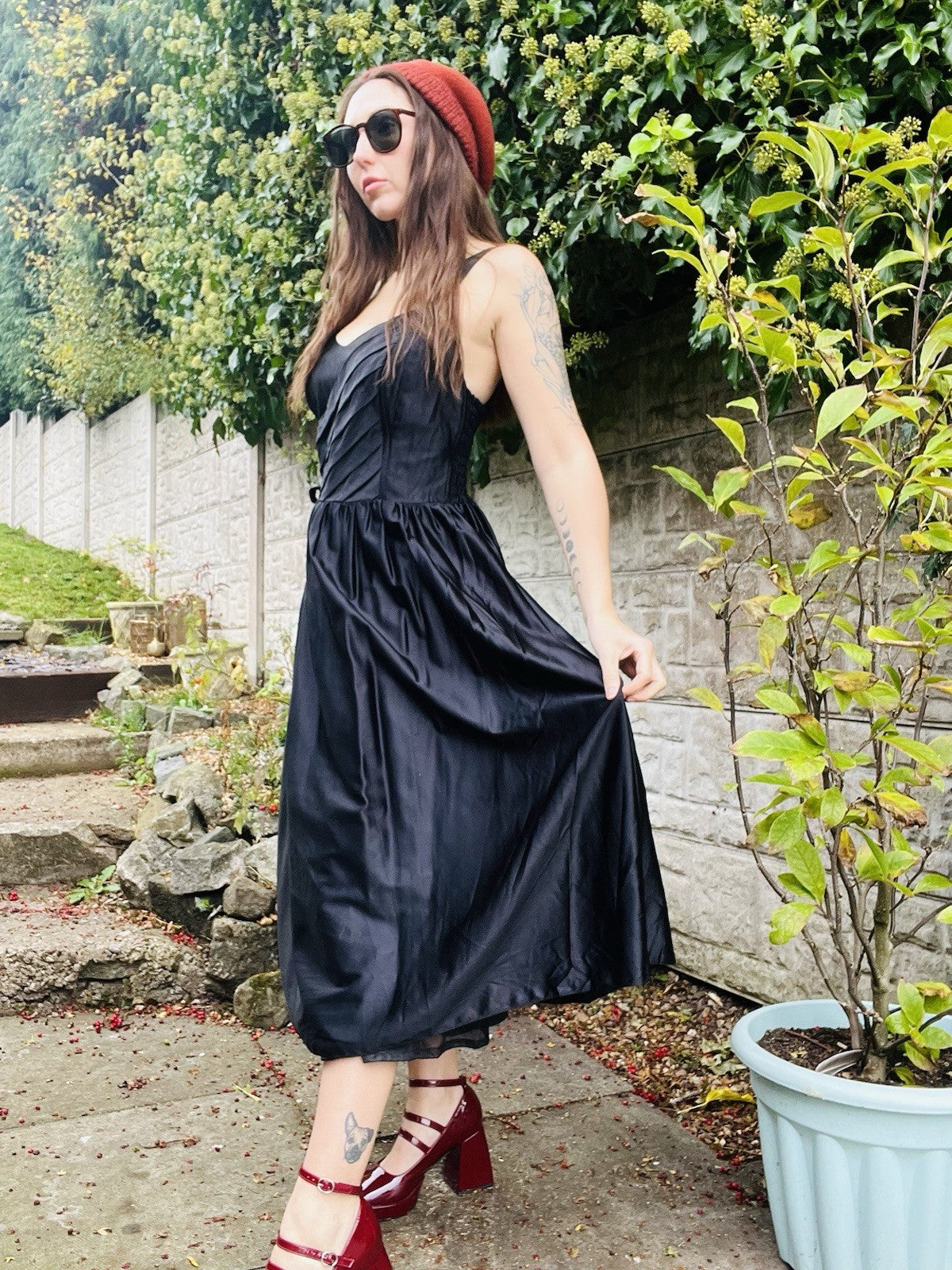 This vintage 1980s party dress is a stylish retro piece in black, perfect for a special occasion. With a midi length and strappy design, this size 16 dress is made from polyester and exudes a classic elegance. Ideal for women looking to add a touch of vintage charm to their wardrobe, this dress combines timeless style with a hint of nostalgia from the 1980s era.