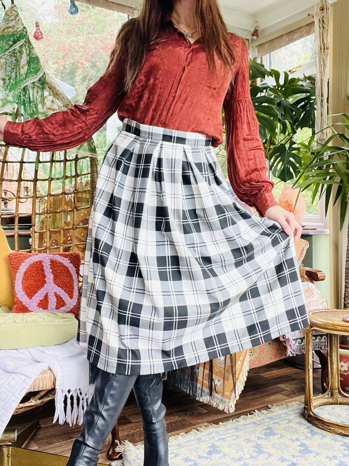 Vintage 1980s Plaid Skirt, Pleated Check Tartan Kilt Style Skirt Black White 14