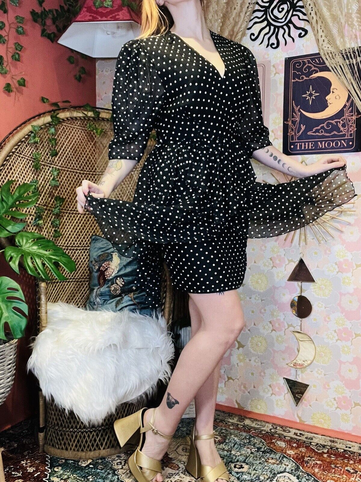 Vintage 1980s Polcadot Dress By Yessica Retro Floaty Assymetric Design Black 8