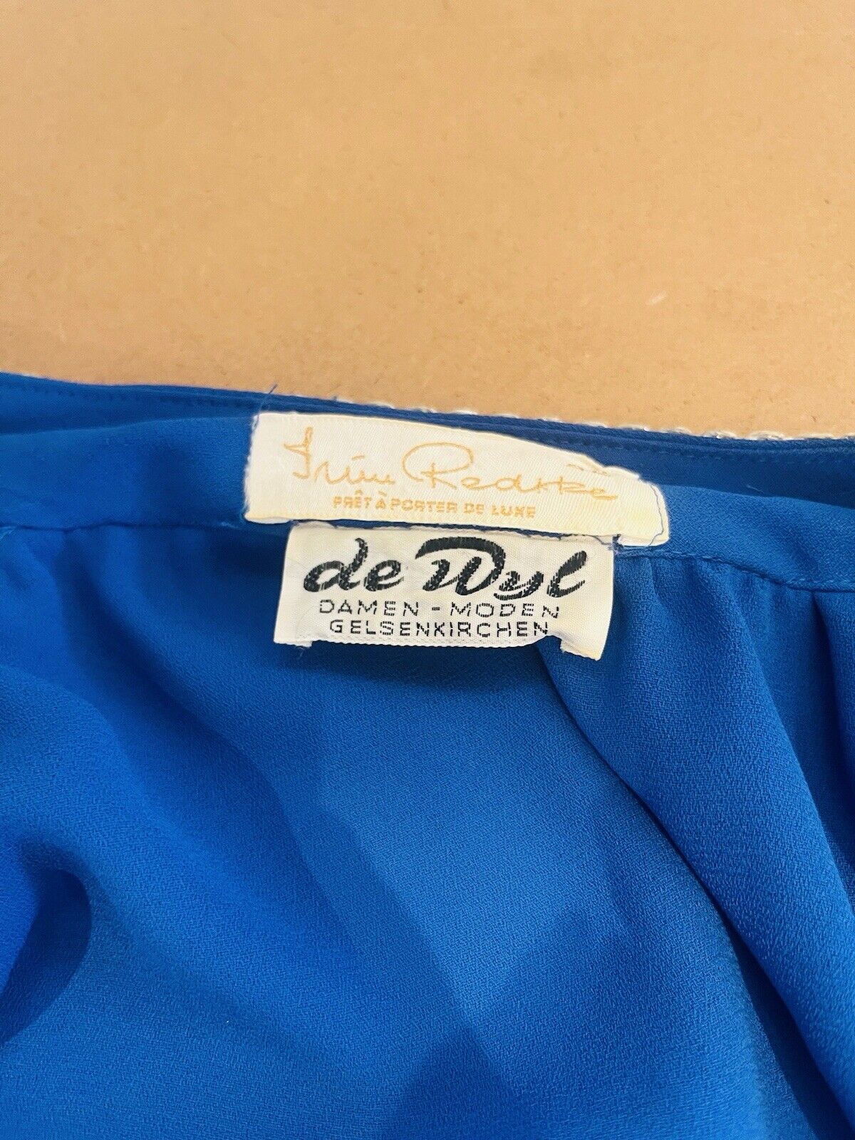 This vintage 1980s cardigan is a striking blue waterfall jacket with silver trim, giving it a unique and eye-catching look. The cardigan is designed in an oversized style, perfect for those who enjoy a relaxed and comfortable fit. Made by De Wyl, this size 14 regular piece exudes a retro charm that can be styled in various ways to create a fashion statement.