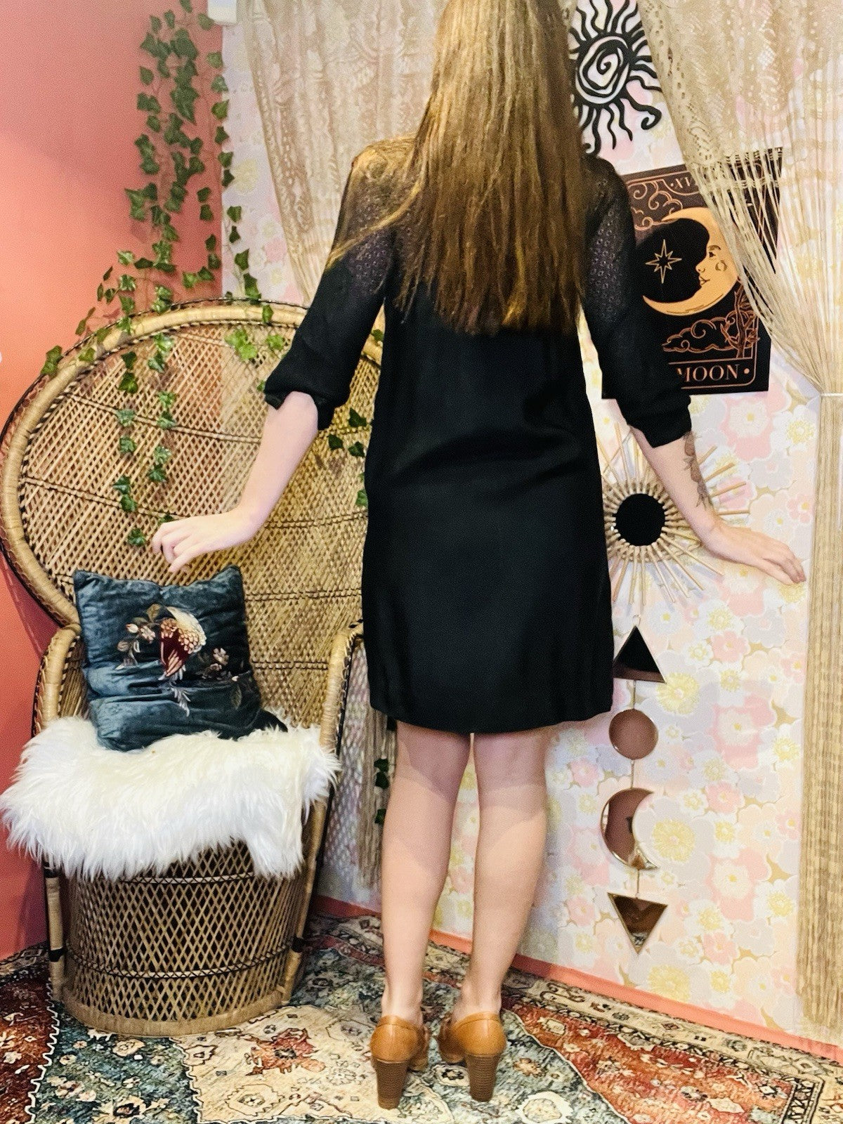This vintage 60s mini dress in black, size 6, exudes retro charm with its sheer lace neck and sleeves and mod/gogo look. Perfect for any woman wanting to channel her inner 1960s fashionista, the dress features a flattering silhouette with a 36-inch chest and 34-inch waist. This dress is a timeless piece that is sure to make a statement at any special occasion.