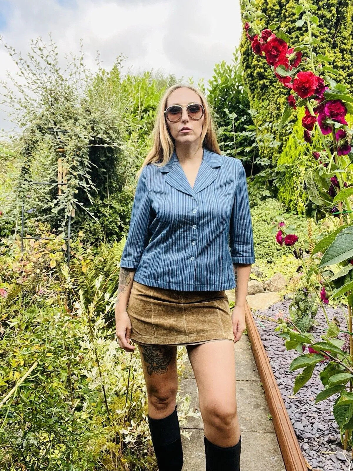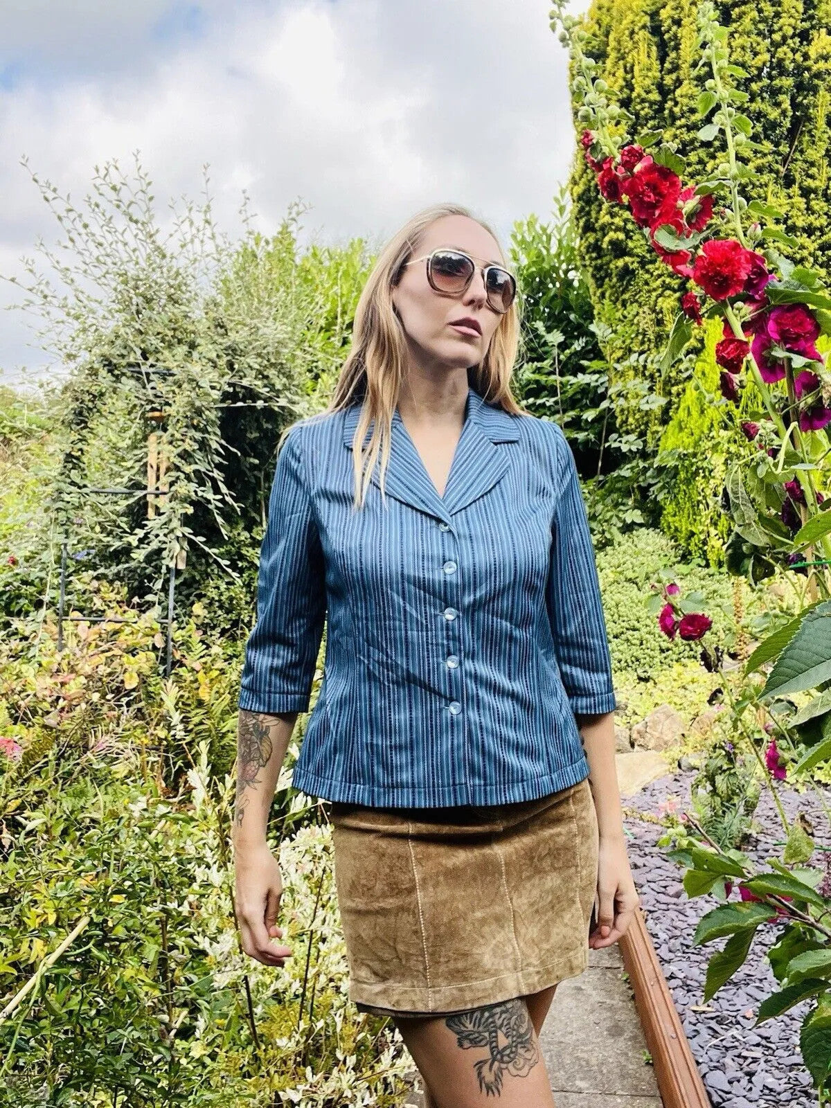 This Vintage 60s Striped Blouse is a stylish and classic addition to any woman's wardrobe. With its 3/4 sleeves, collar, and blue stripes, this shirt exudes a timeless charm that is perfect for any occasion. Made to fit a size 10-12, this blouse is versatile and can be styled in so many different ways. Add a touch of retro flair to your outfit with this flattering and fashionable vintage piece. Pit to pit 18”