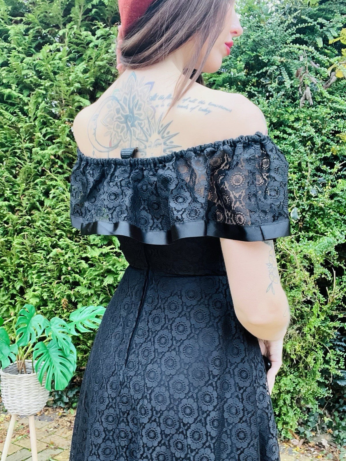 Vintage 70s maxi dress Black Size 8 by C&A Bardot Off Shoulder Whimsigoth Lace