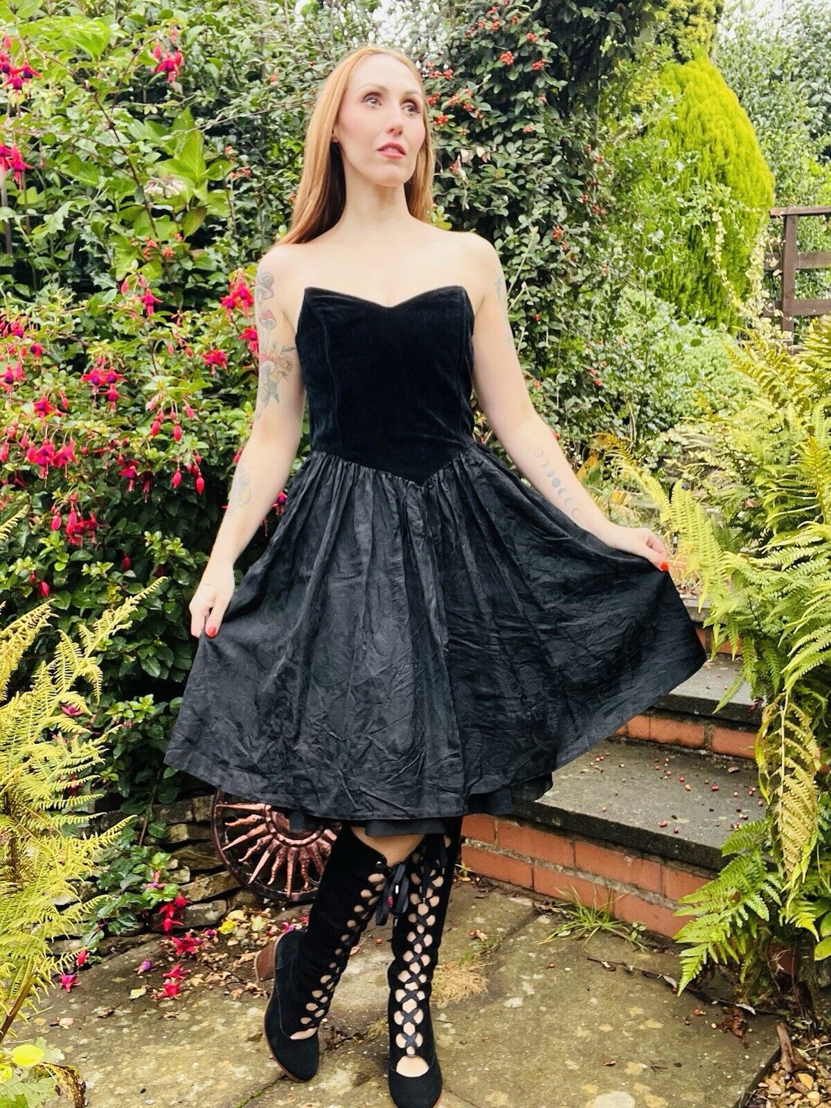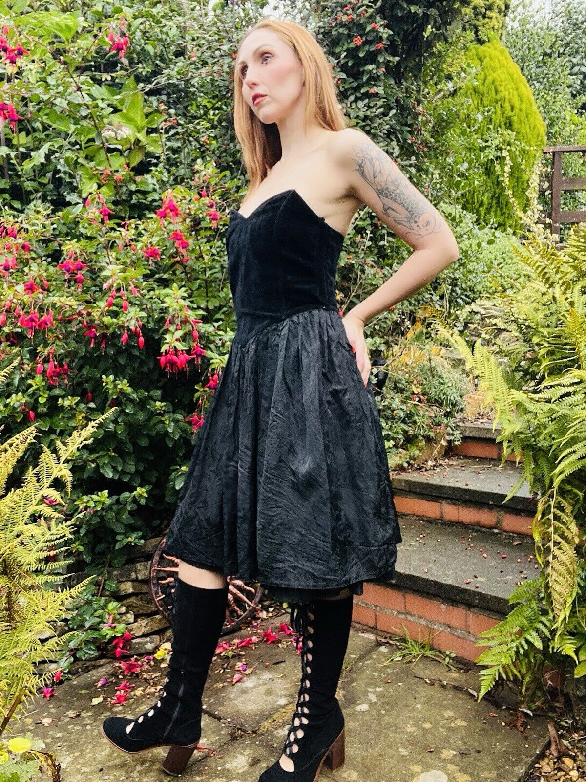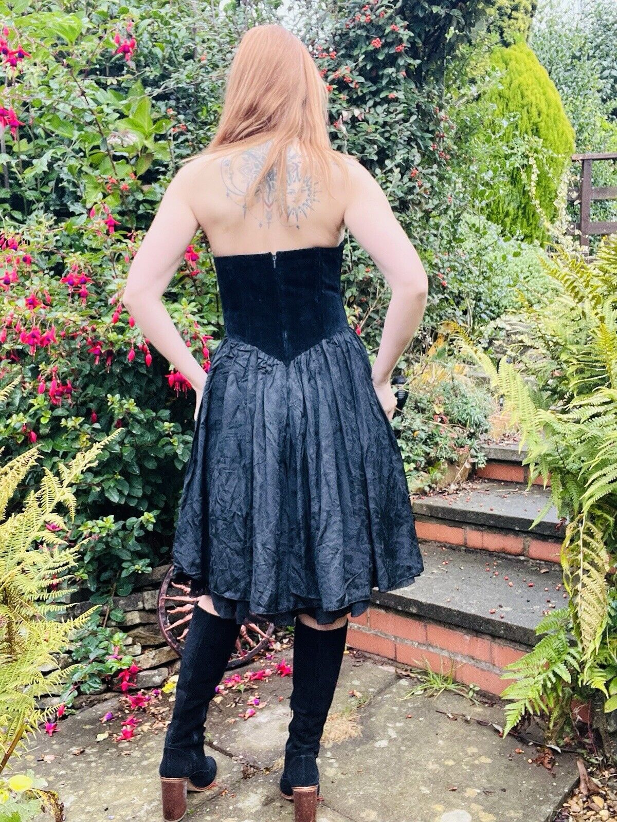 This vintage 80s party dress by Nicowa is a stunning addition to any wardrobe. The strapless velvet bodice features a beautiful paisley satin design in black, making it perfect for a glamorous night out or a special occasion. The dress is a size 10 and has been well-maintained, ensuring its quality for the modern buyer.