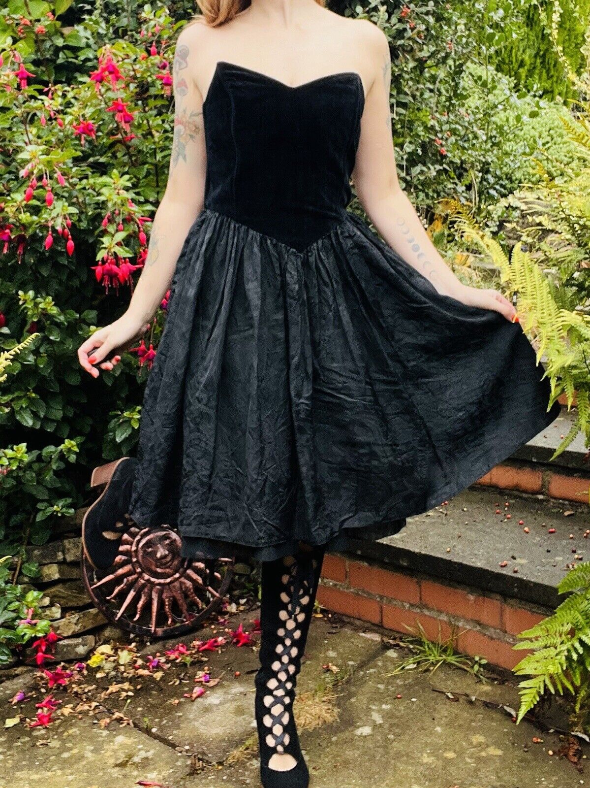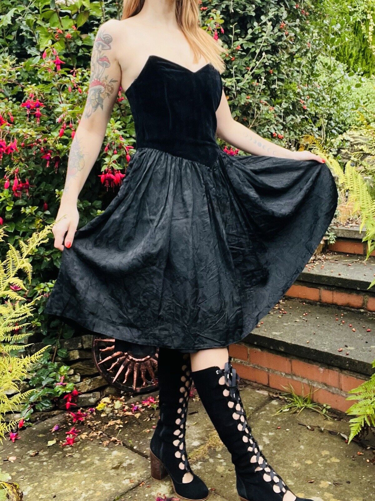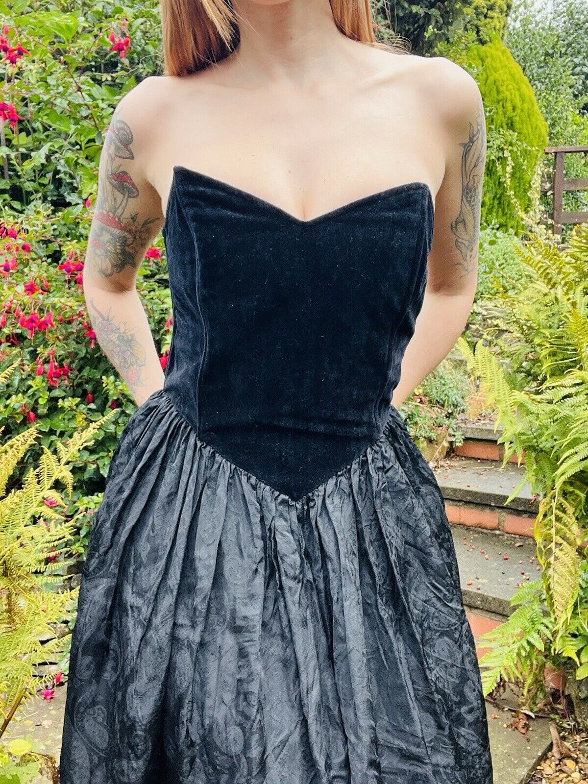 Vintage 80s Party Dress By Nicowa Strapless Velvet Bodice Paisley Satin Black 10