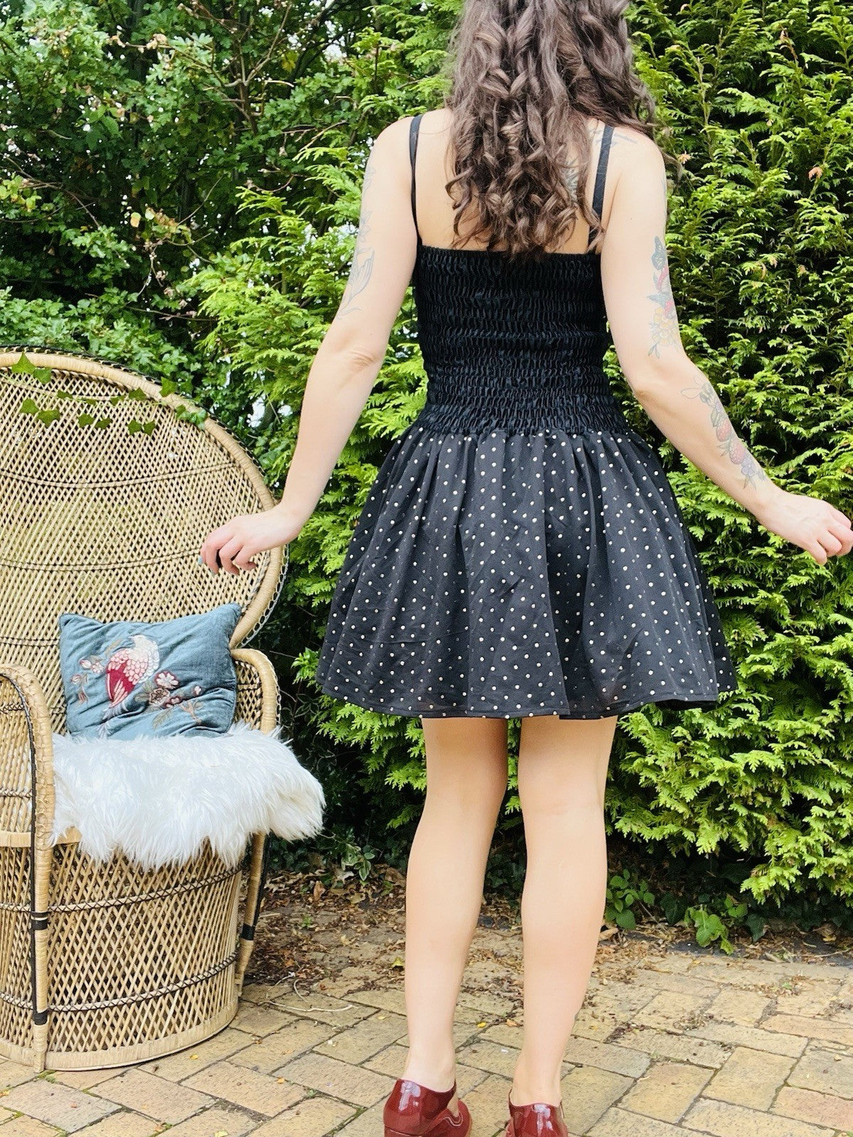 This vintage 80s party dress features a ruched waist and an A-line silhouette with a puffy skirt, perfect for adding a touch of whimsy to any special occasion. The polka dot design with a bow detail adds a playful and feminine touch, while the black polyester material gives it a classic and sophisticated look. The size small (8-10) ensures a comfortable and flattering fit for the modern woman looking to channel her inner 80s glam.