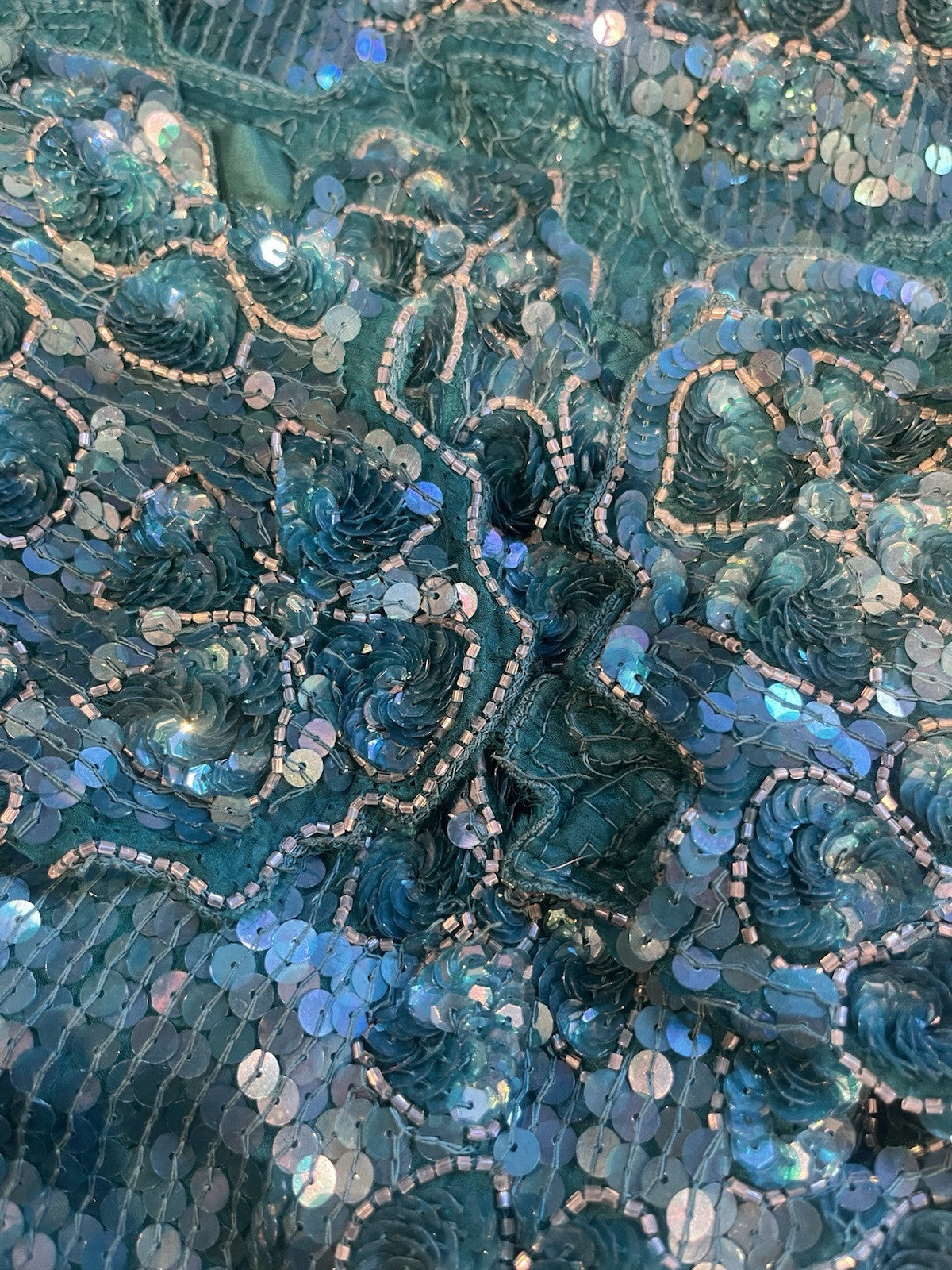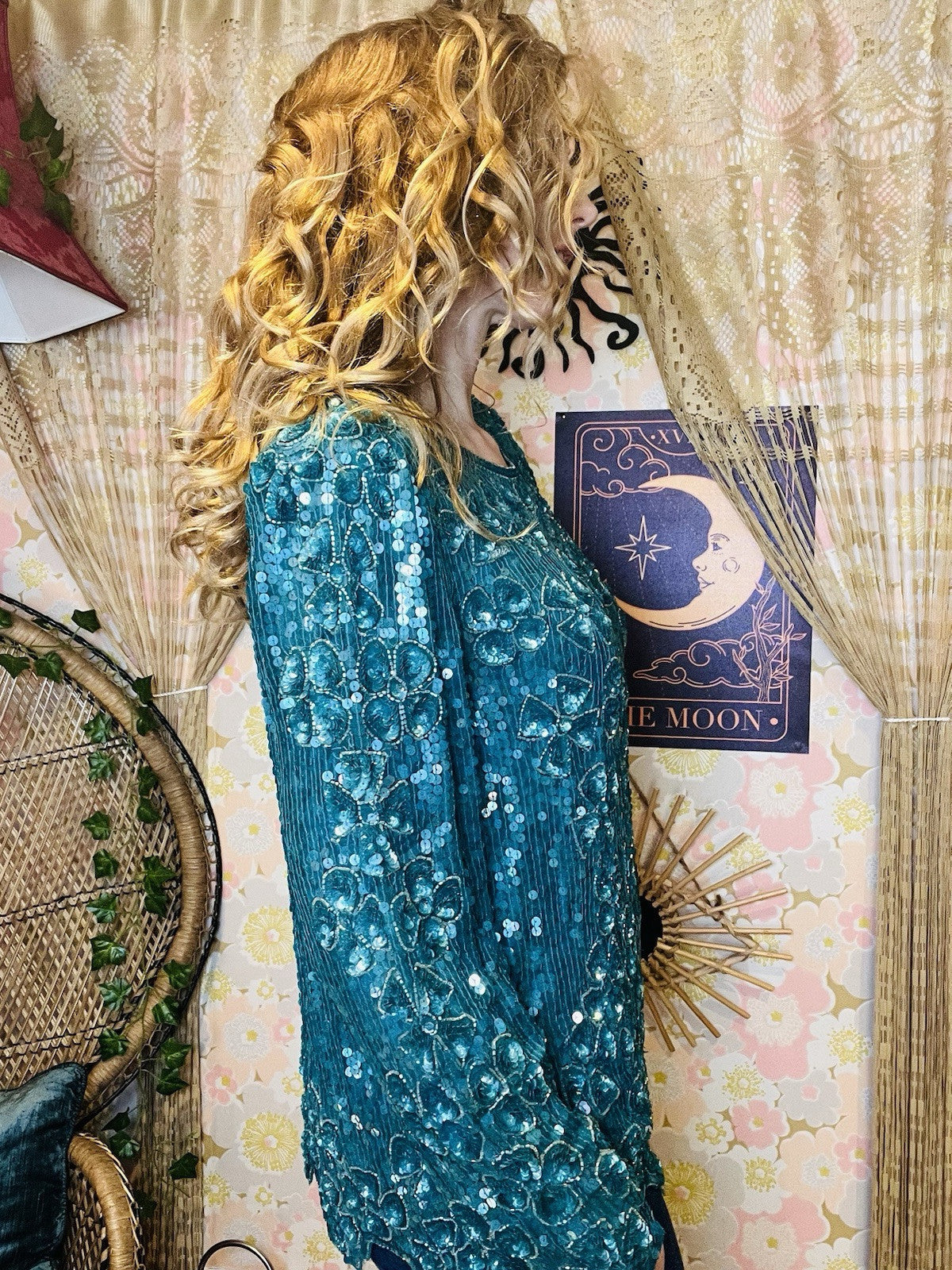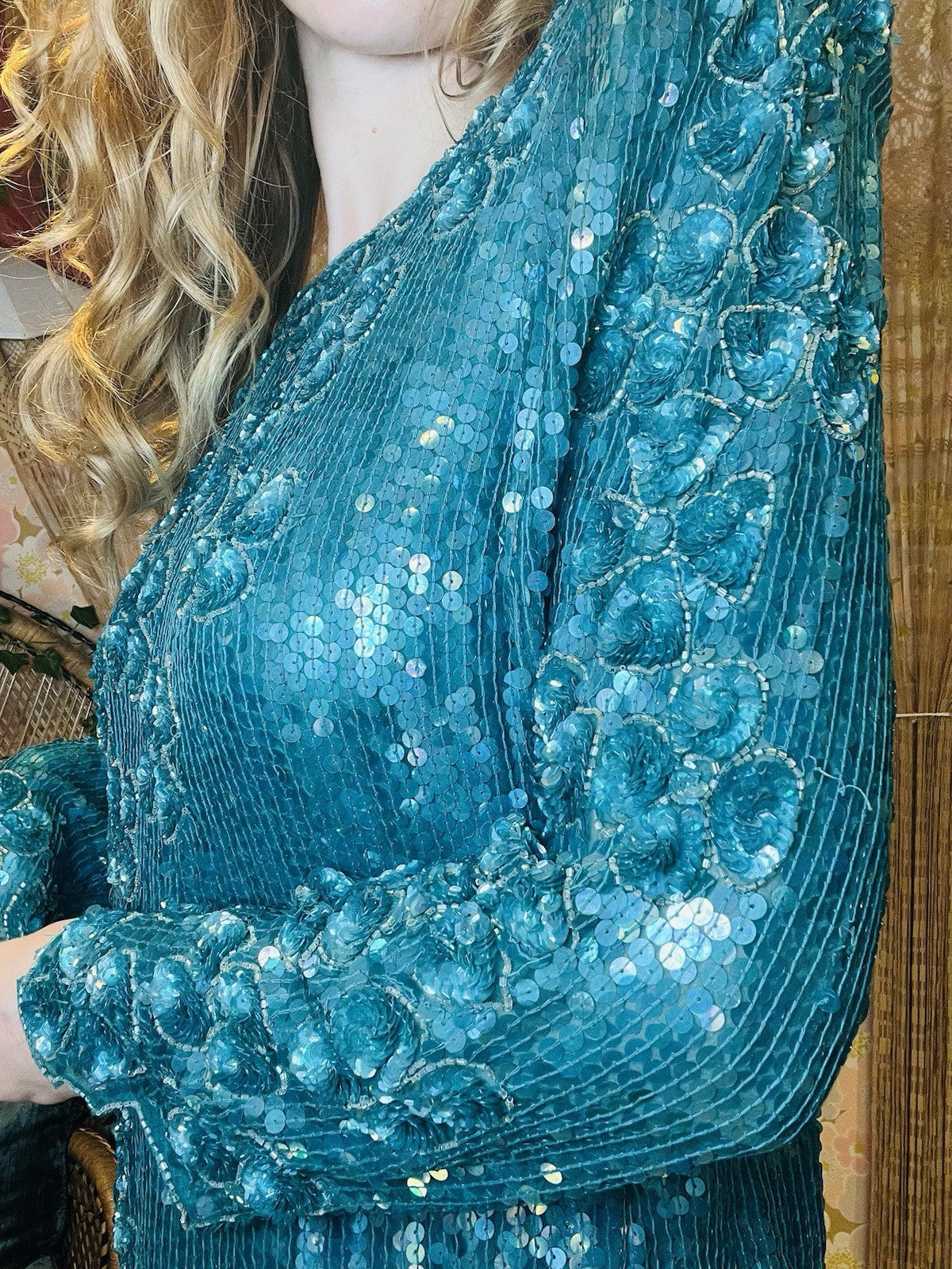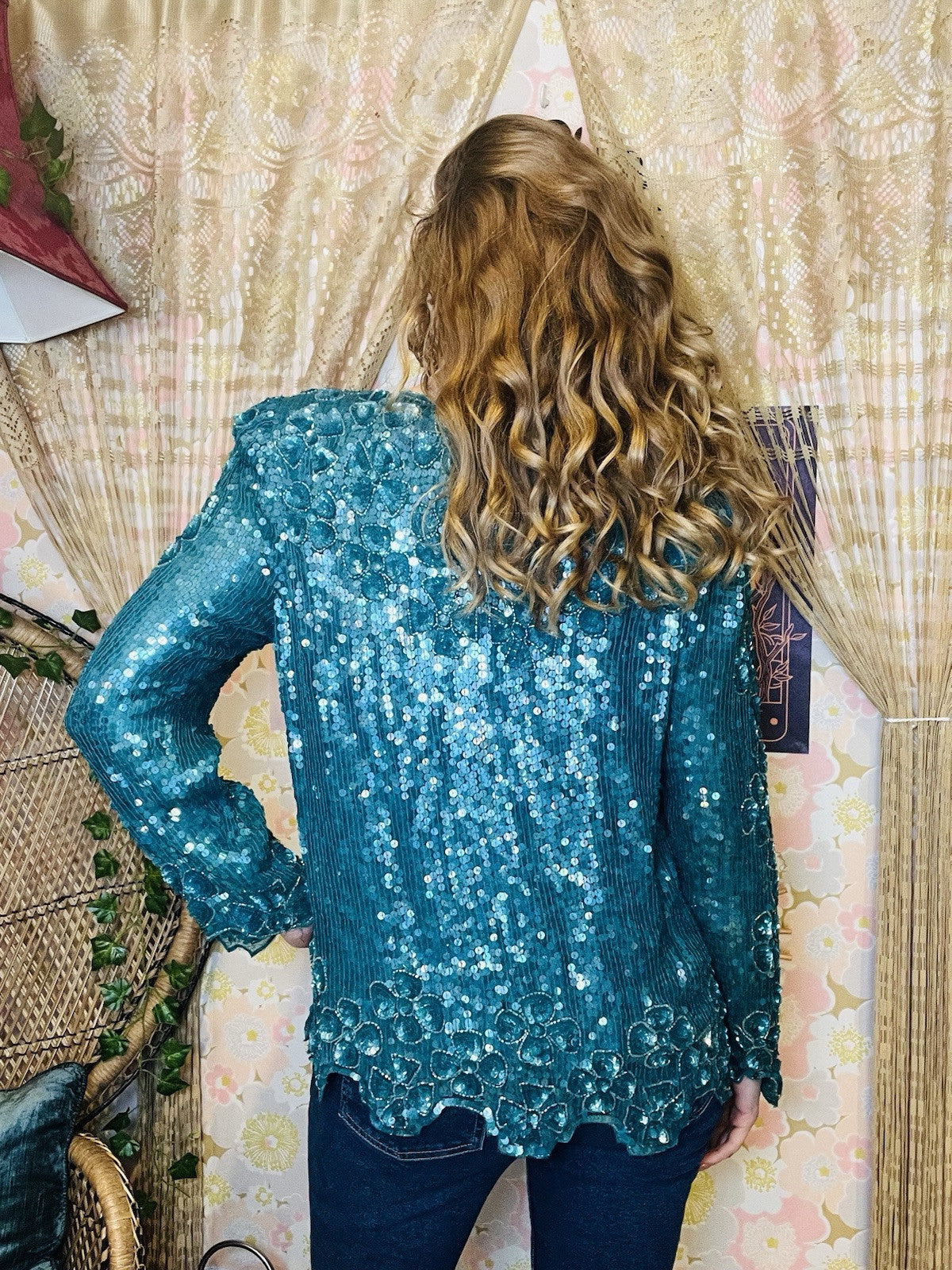 It features shoulder pads, which were all the rage in the 80s, and adds a unique character to the blouse, making it a perfect statement piece for any fashion enthusiast looking to add a dash of retro flair to their outfit. There are a few sequins missing here and there but not noticeable when wearing. The last image show the cuffs where the missing sequins is most visible on one arm.