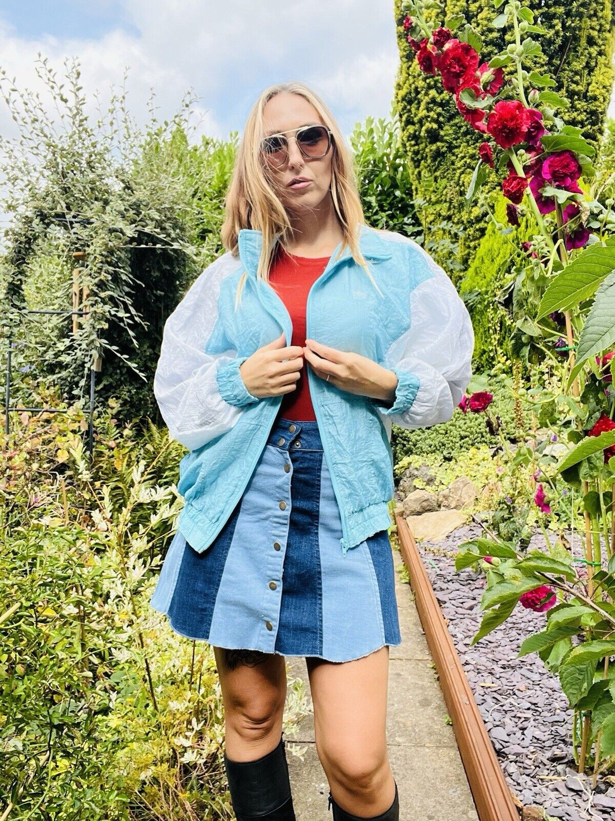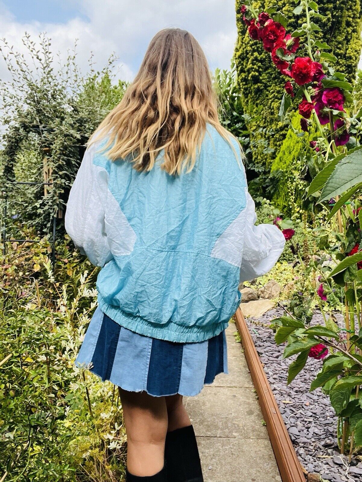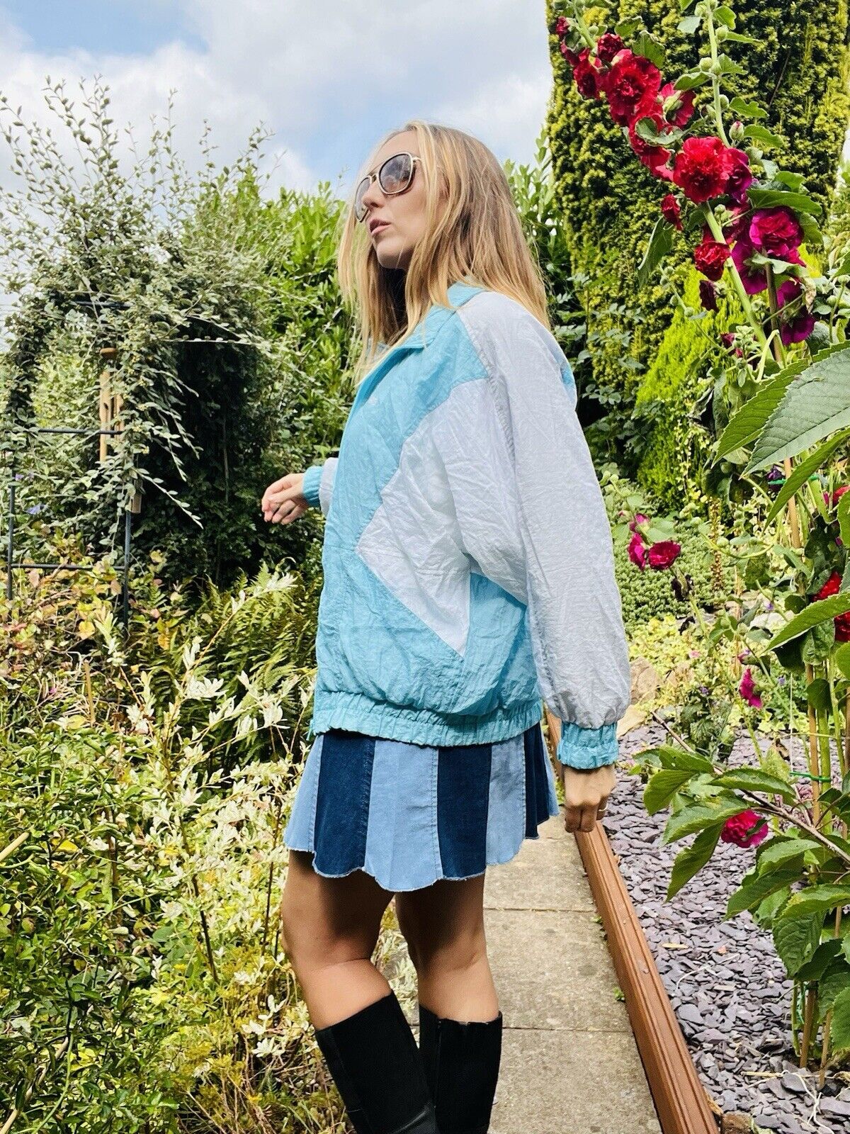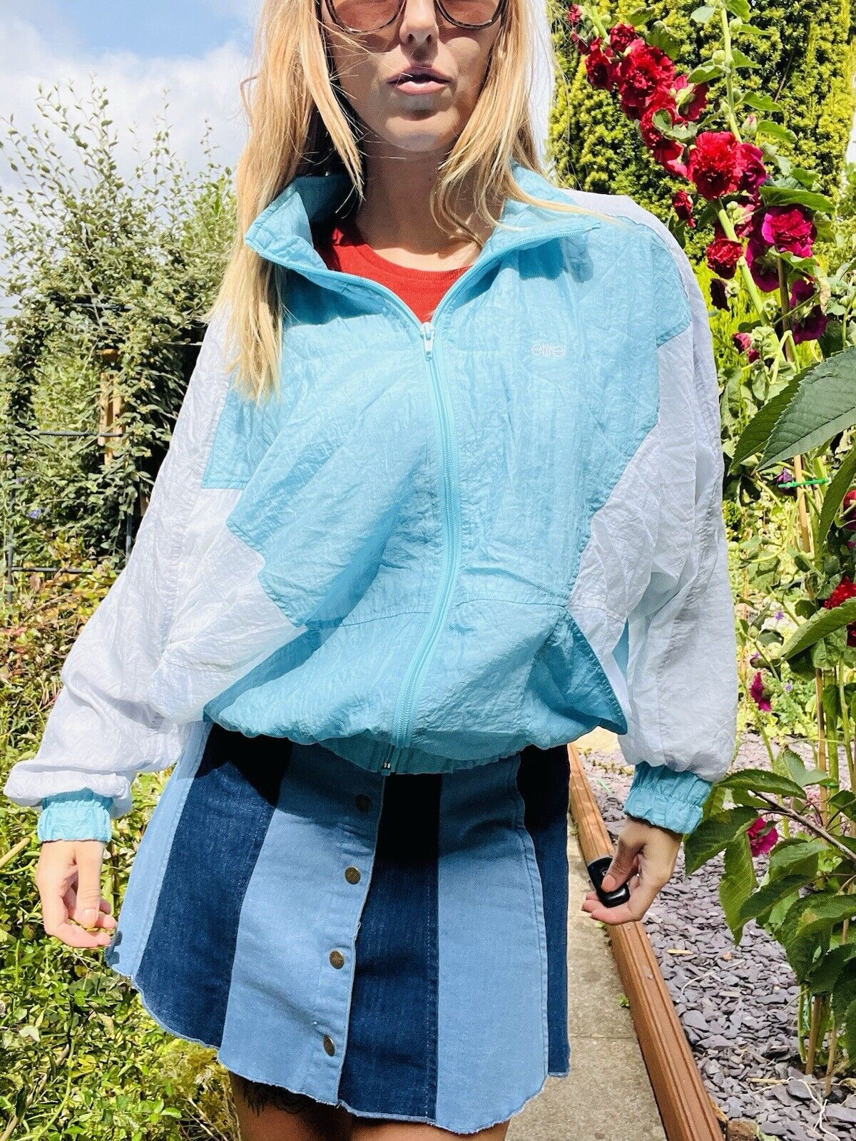 Vintage 80s Shell Suit Jacket Zip Up Oversized Ladies Blue White Size 8-10