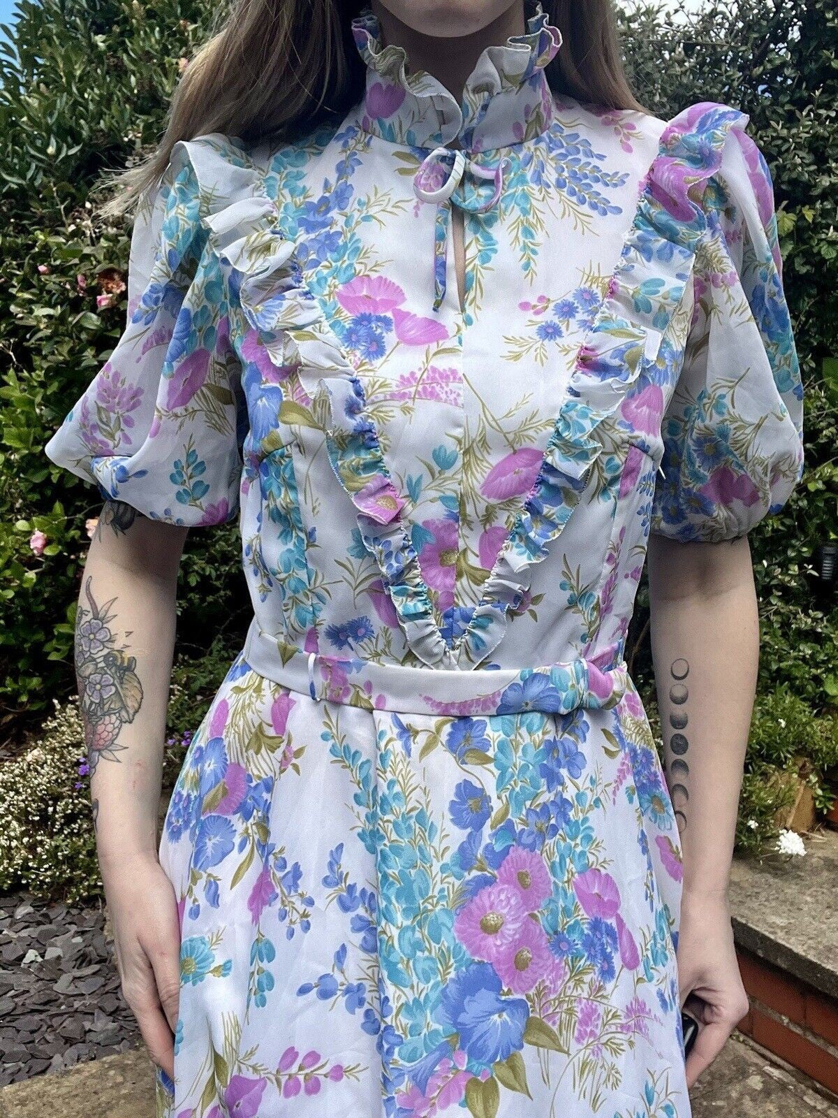 Embrace the prairie style with this stunning vintage summer dress. Maxi in length, this dress is perfect for any occasion. The dress features beautiful flowers that add a touch of elegance to the overall look. The dress is from the 1980s and is a great addition to any vintage clothing collection.