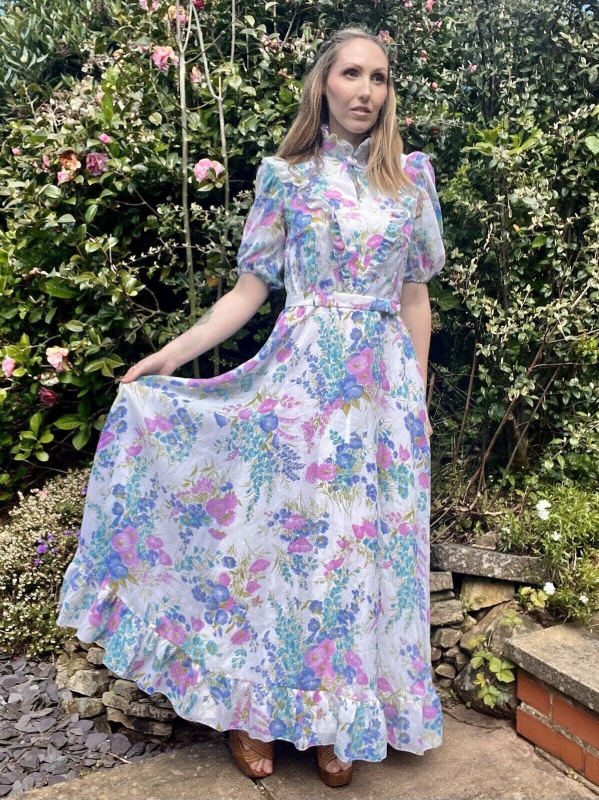 Vintage 80s Summer Dress Maxi Length Prairie Style With Flowers Size 12