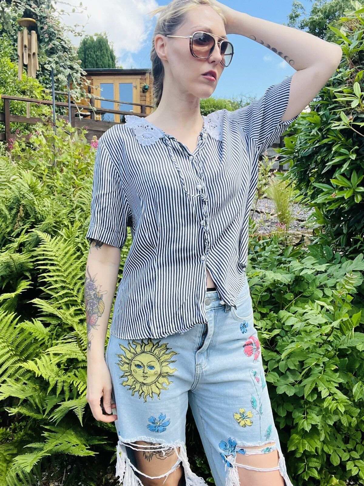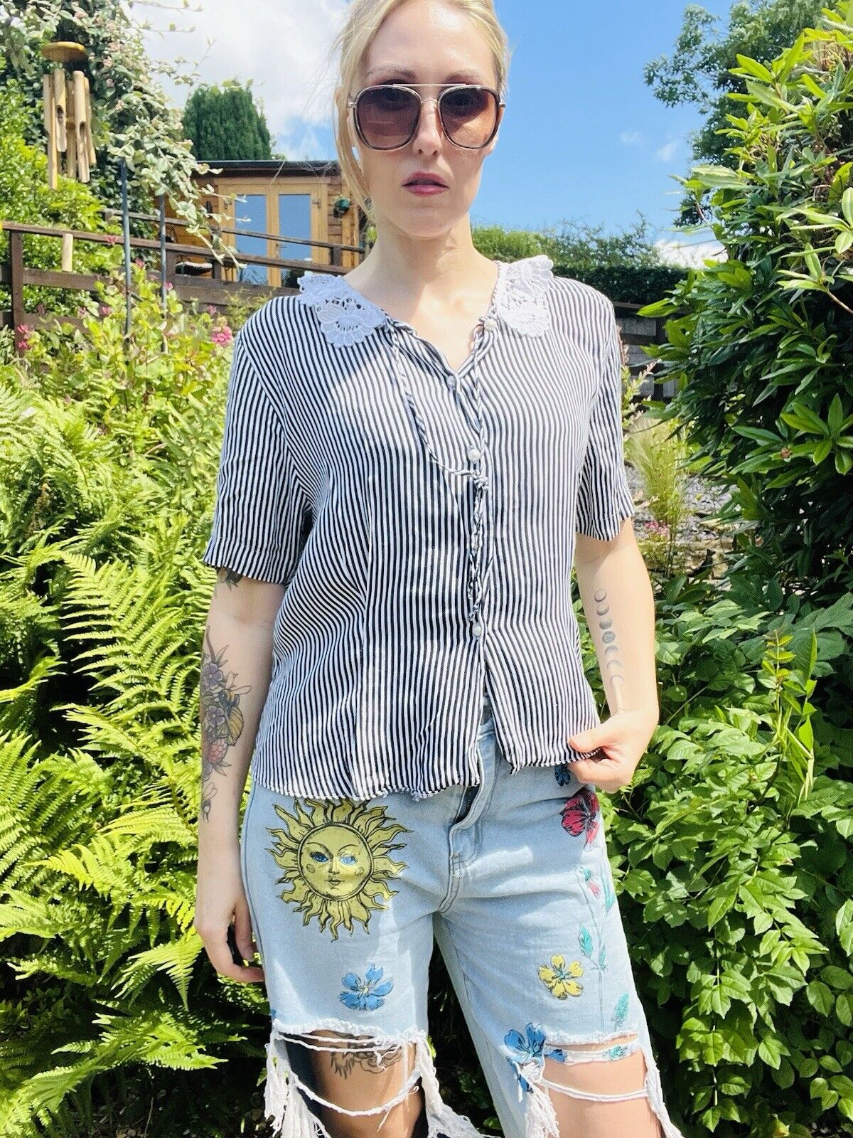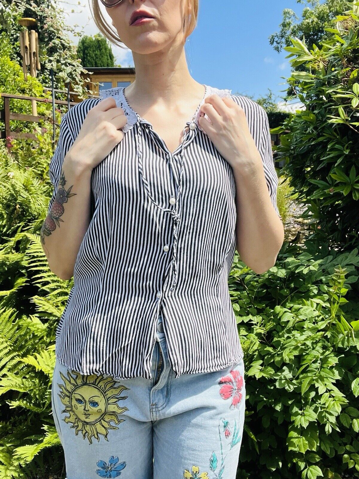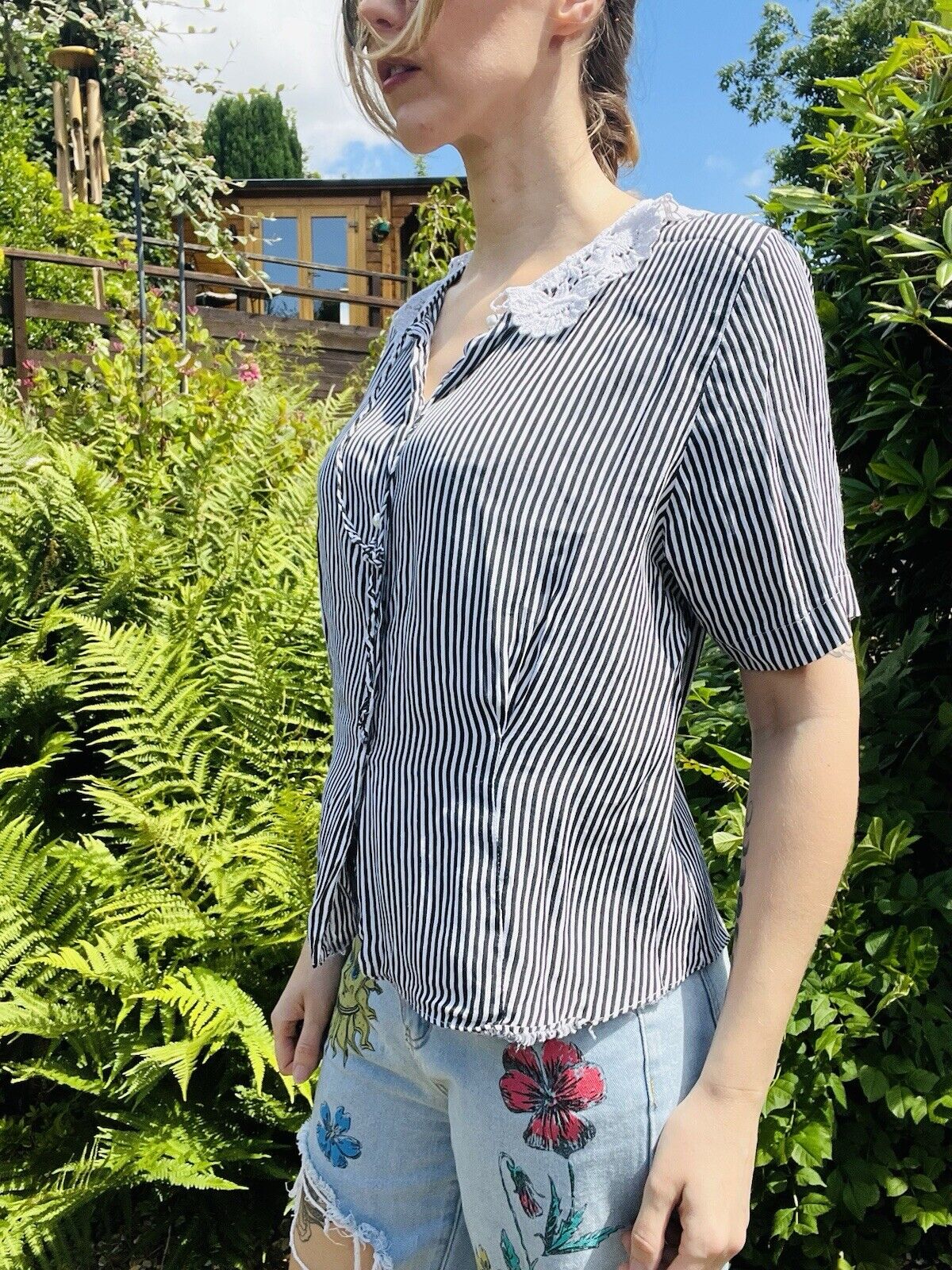 Vintage 90s Blouse By Yessica Striped With Lace Collar Size 16