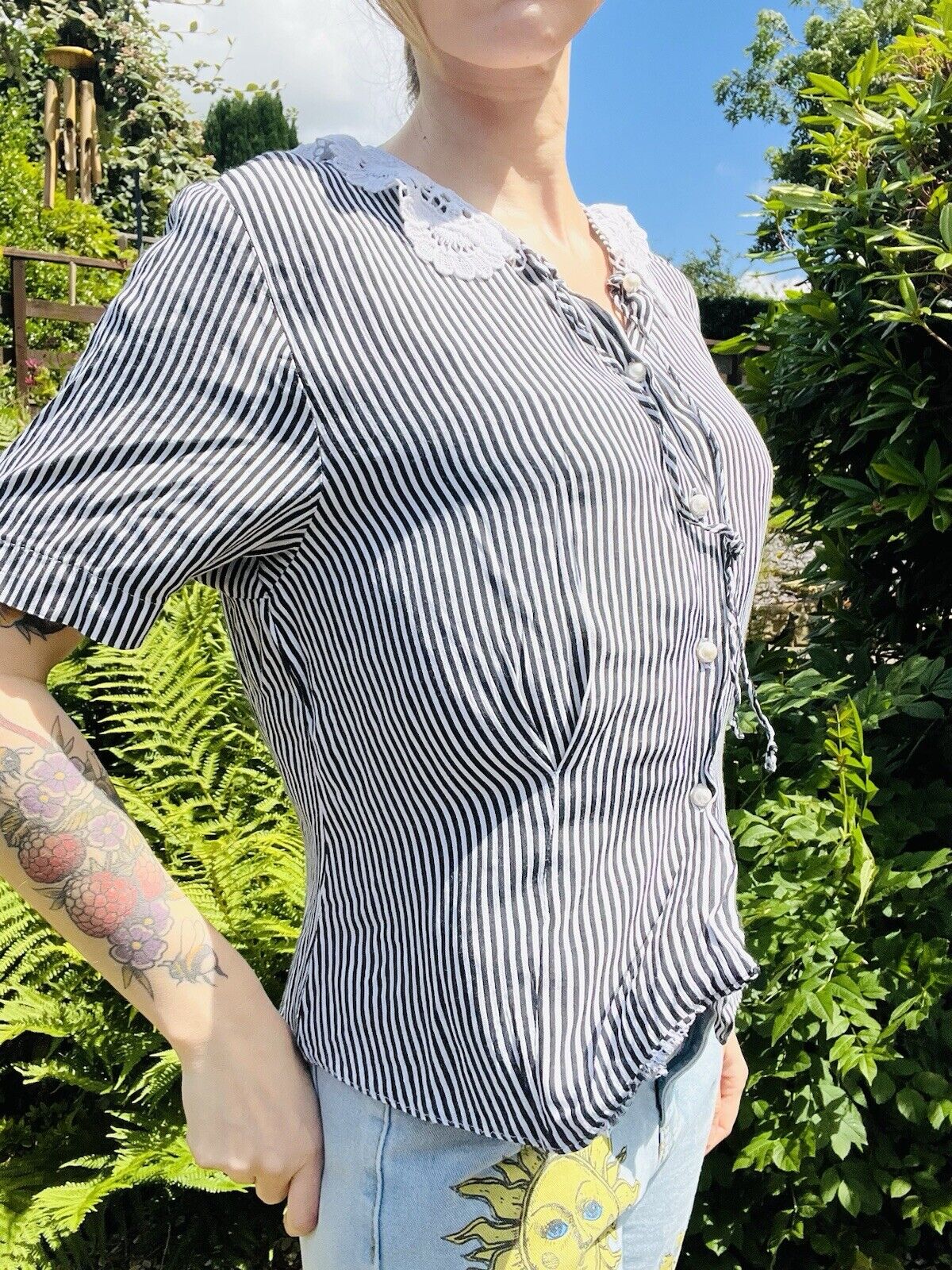 Add a touch of vintage charm to your wardrobe with this 90s blue blouse by Yessica. The blouse features a striped design with a lace collar that adds a feminine touch to the overall look. The blouse is perfect for any occasion, whether it's a casual day out or a formal event. It is available in size 16 and is suitable for women of all ages. Get this vintage blouse today and give your wardrobe a timeless appeal.