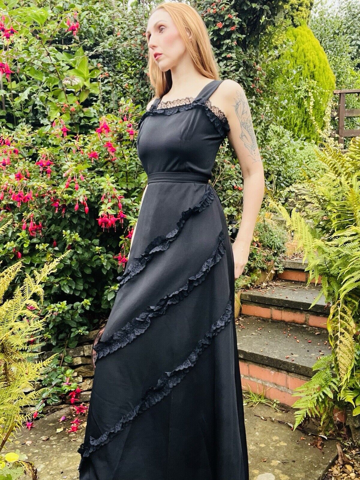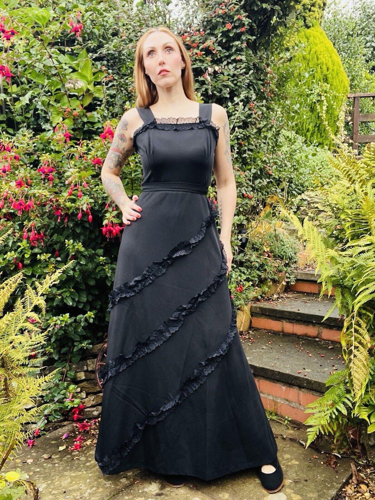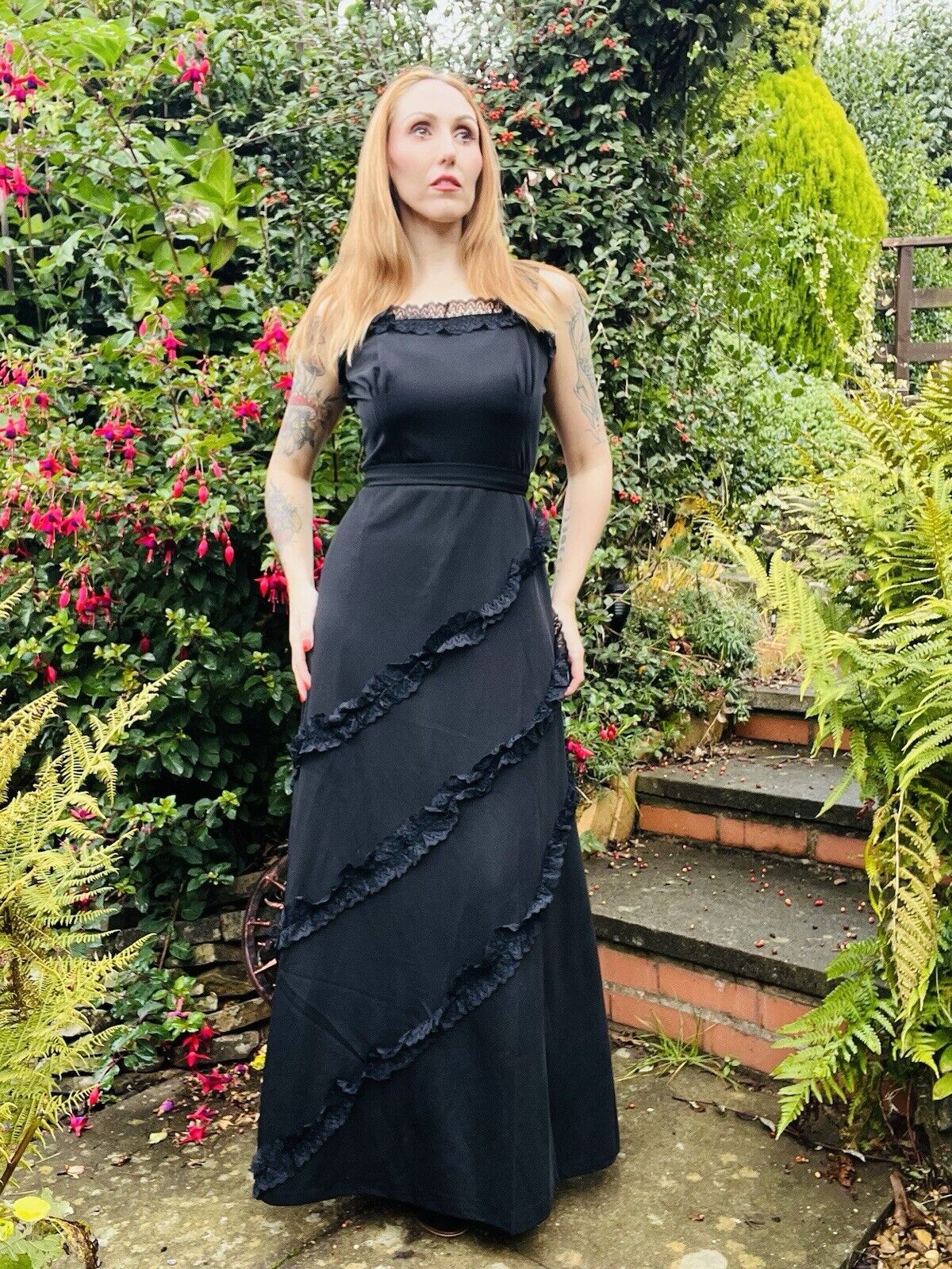 Embrace the charm of the 90s with this stunning vintage dress by Hohe Modelle. The black lace ruffle detail adds a touch of elegance to the long dress, making it a perfect fit for any formal occasion. The dress is available in size 14 and is made of high-quality material that adds a unique texture to the dress.
