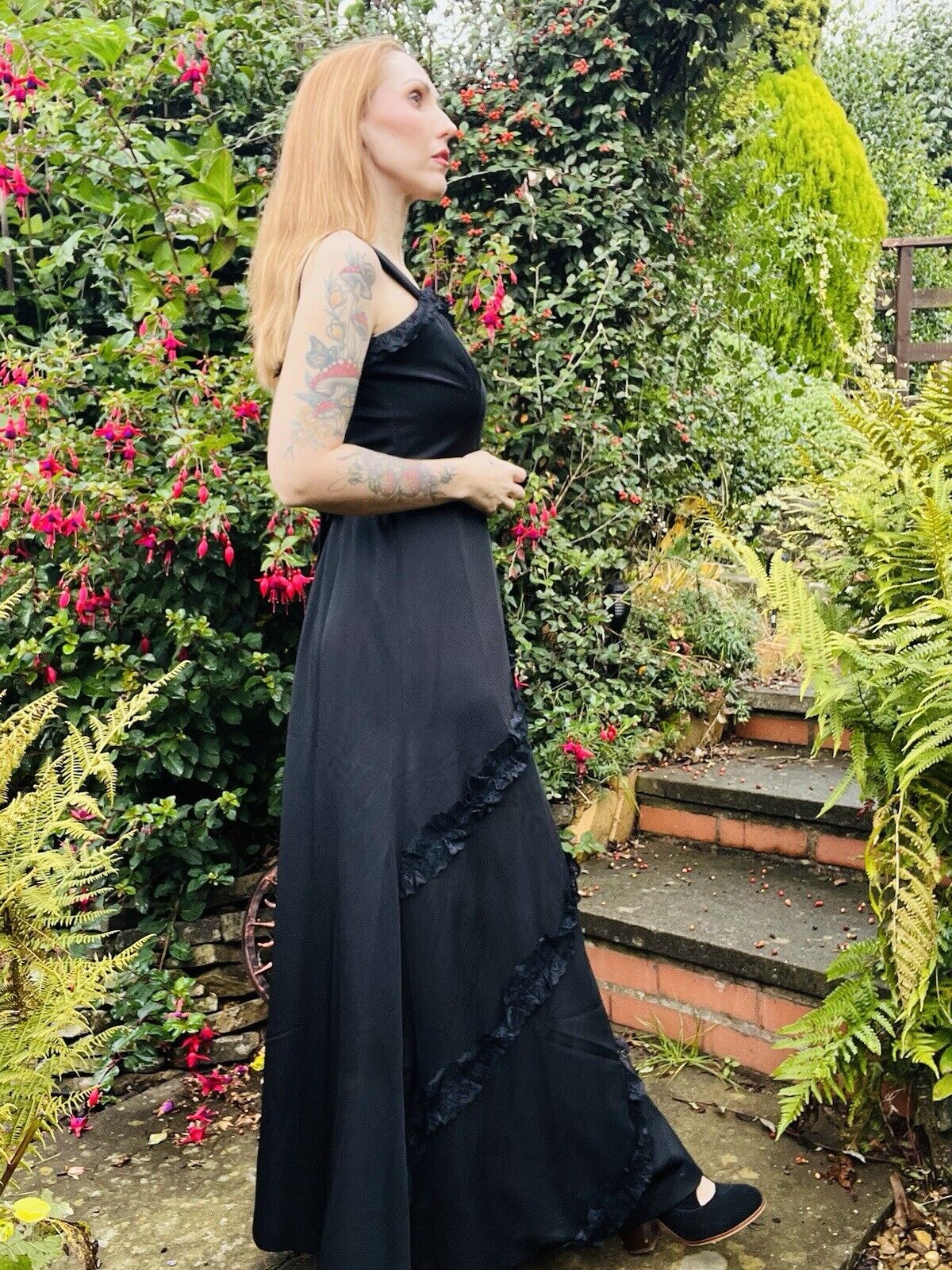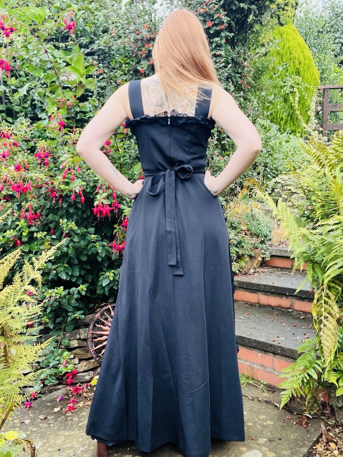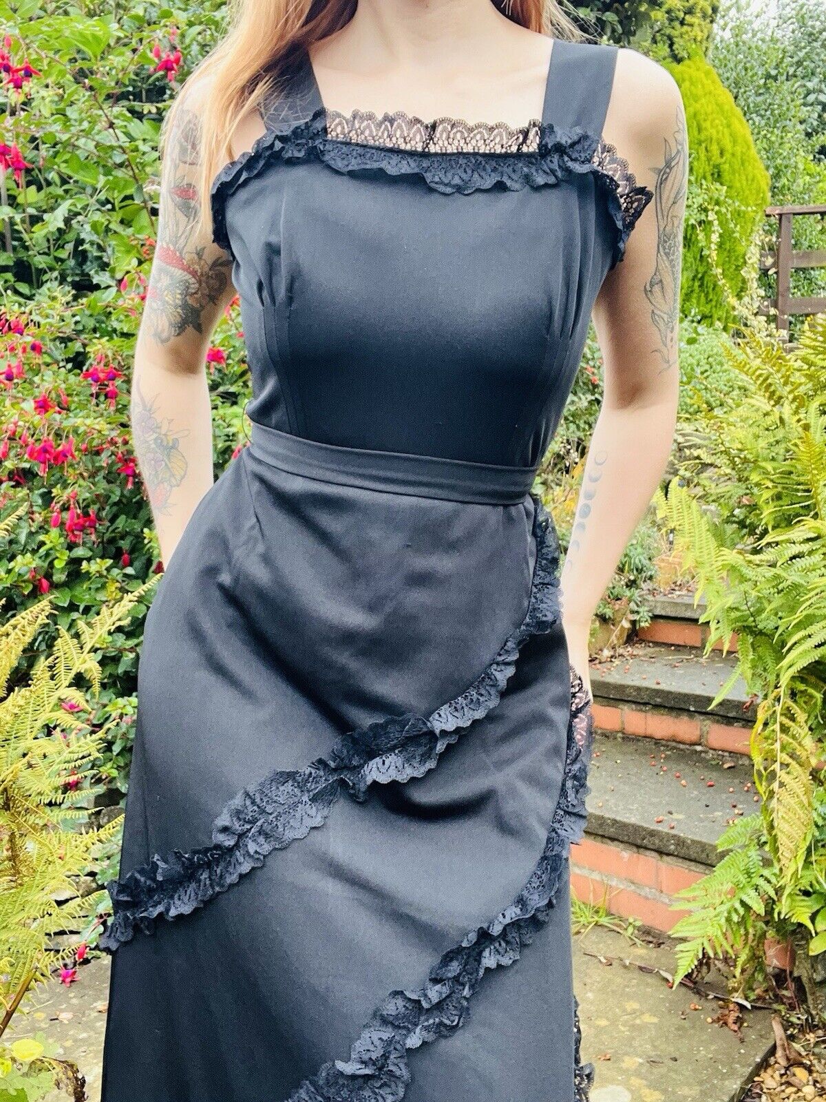 Embrace the charm of the 90s with this stunning vintage dress by Hohe Modelle. The black lace ruffle detail adds a touch of elegance to the long dress, making it a perfect fit for any formal occasion. The dress is available in size 14 and is made of high-quality material that adds a unique texture to the dress.
