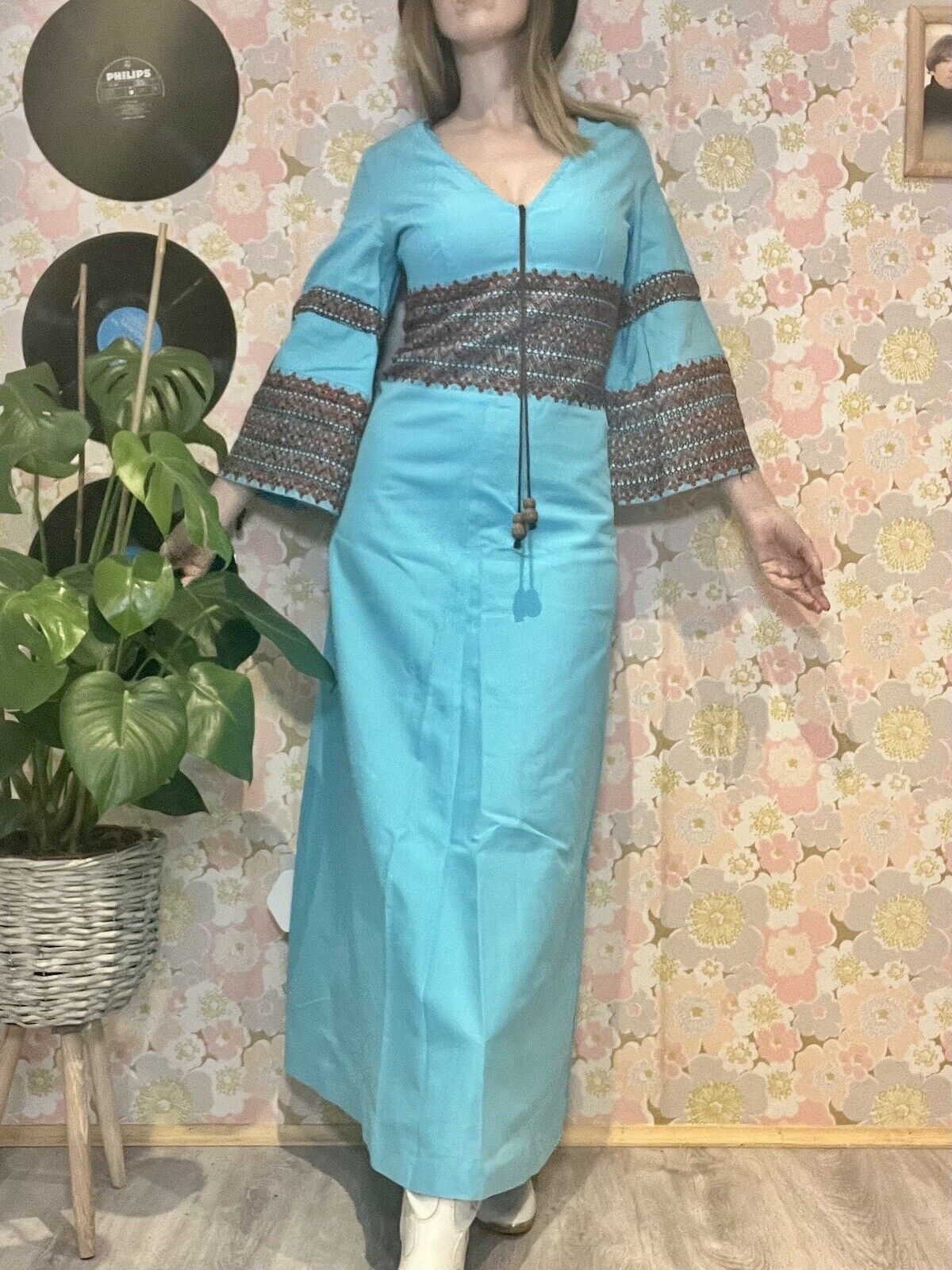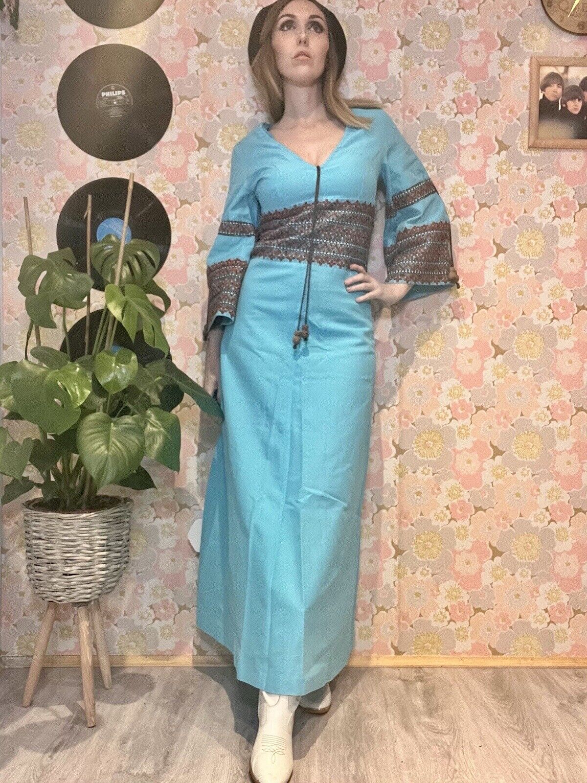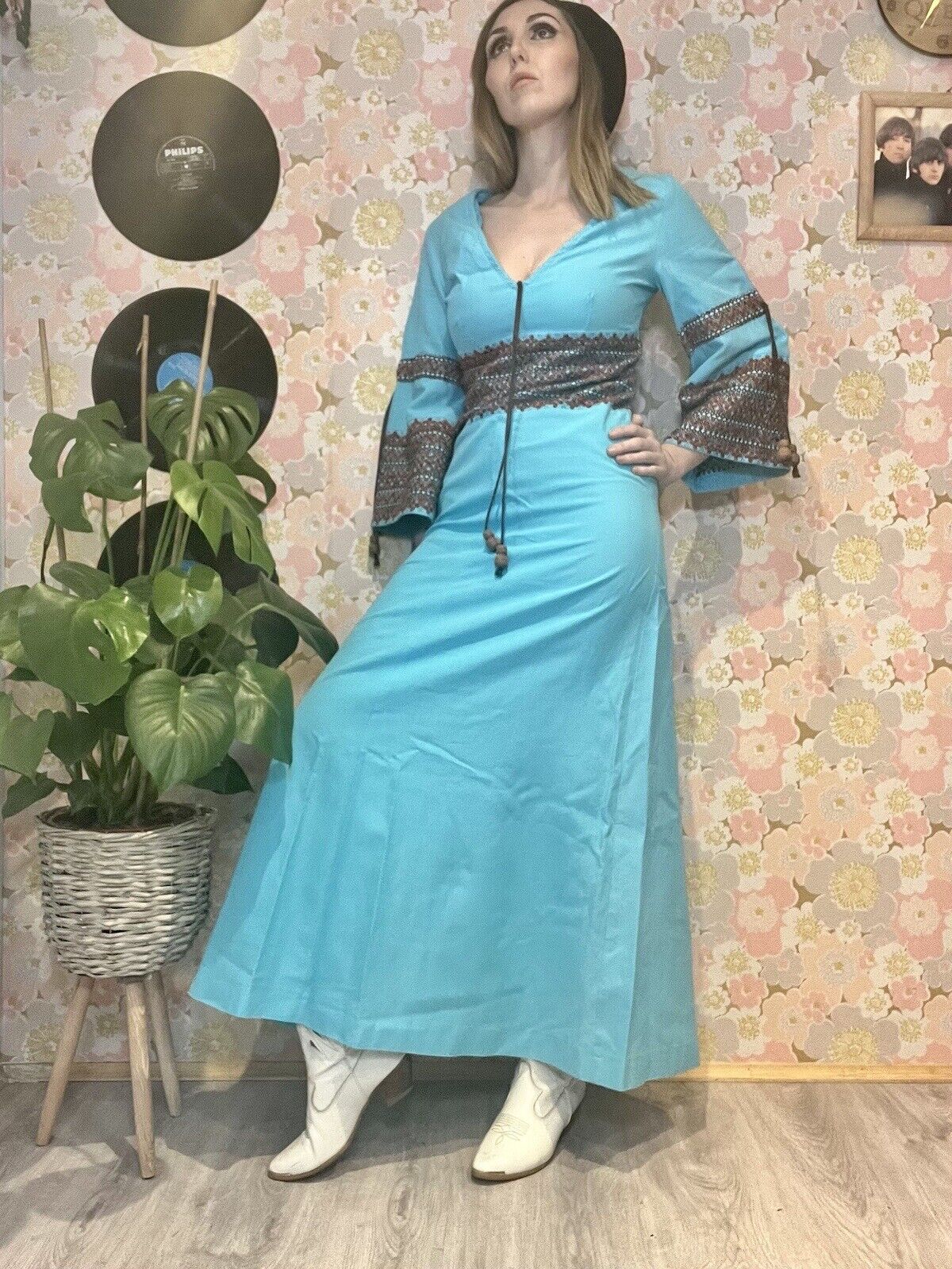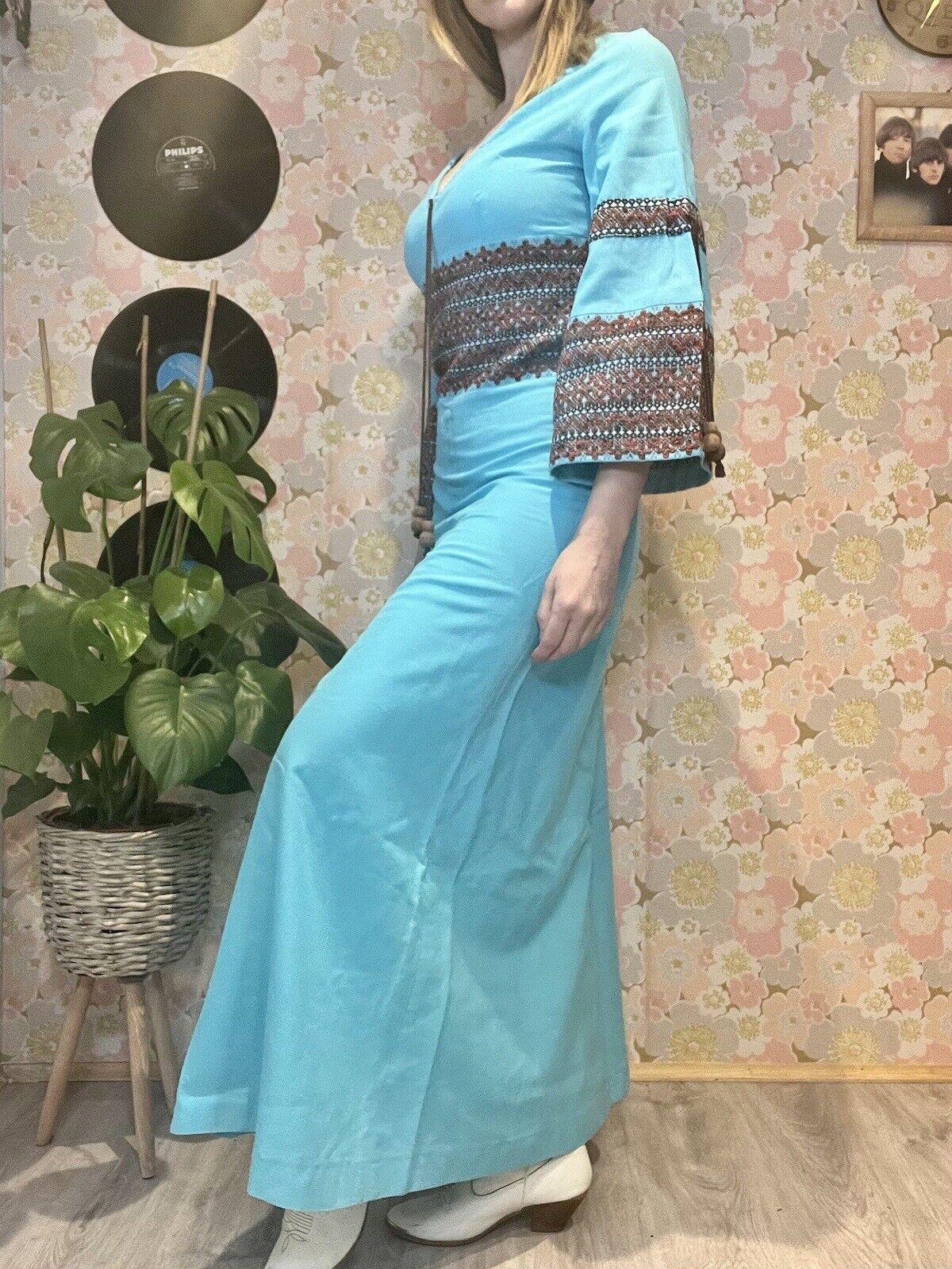 Embrace the bohemian vibe with this vintage Arola maxi dress from the 1970s. With its beautiful bell sleeves and pheasant folk design, it's perfect for any casual or festival occasion. This original piece in a UK size 10 features a stunning light blue hue and is sure to make a statement.
