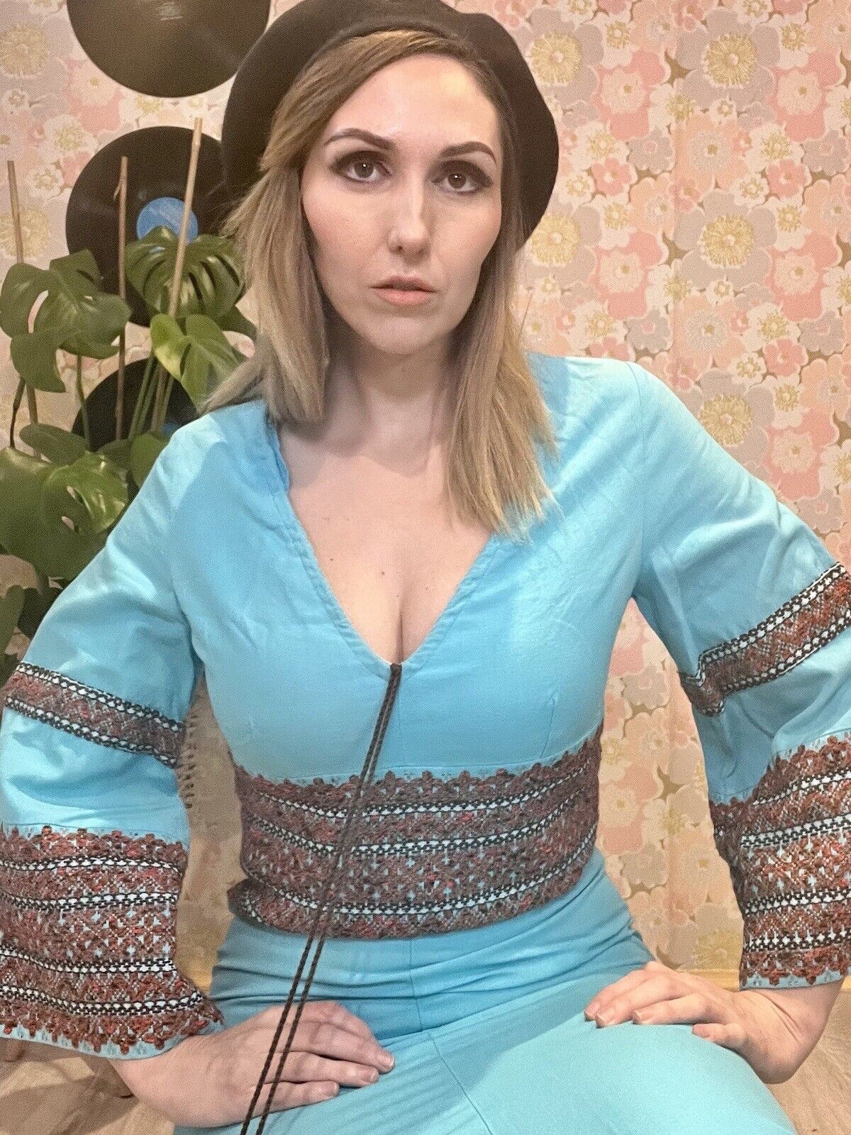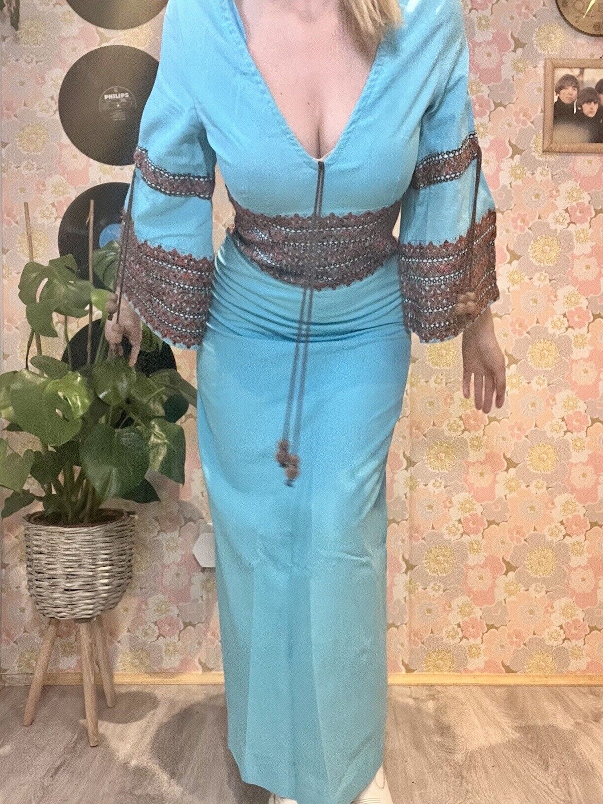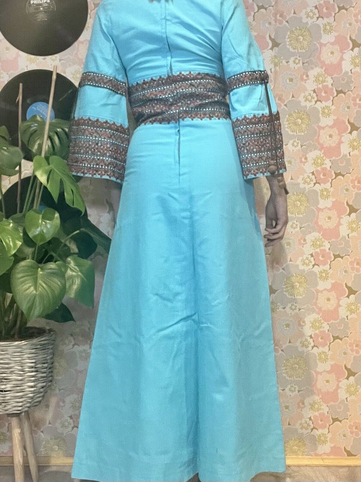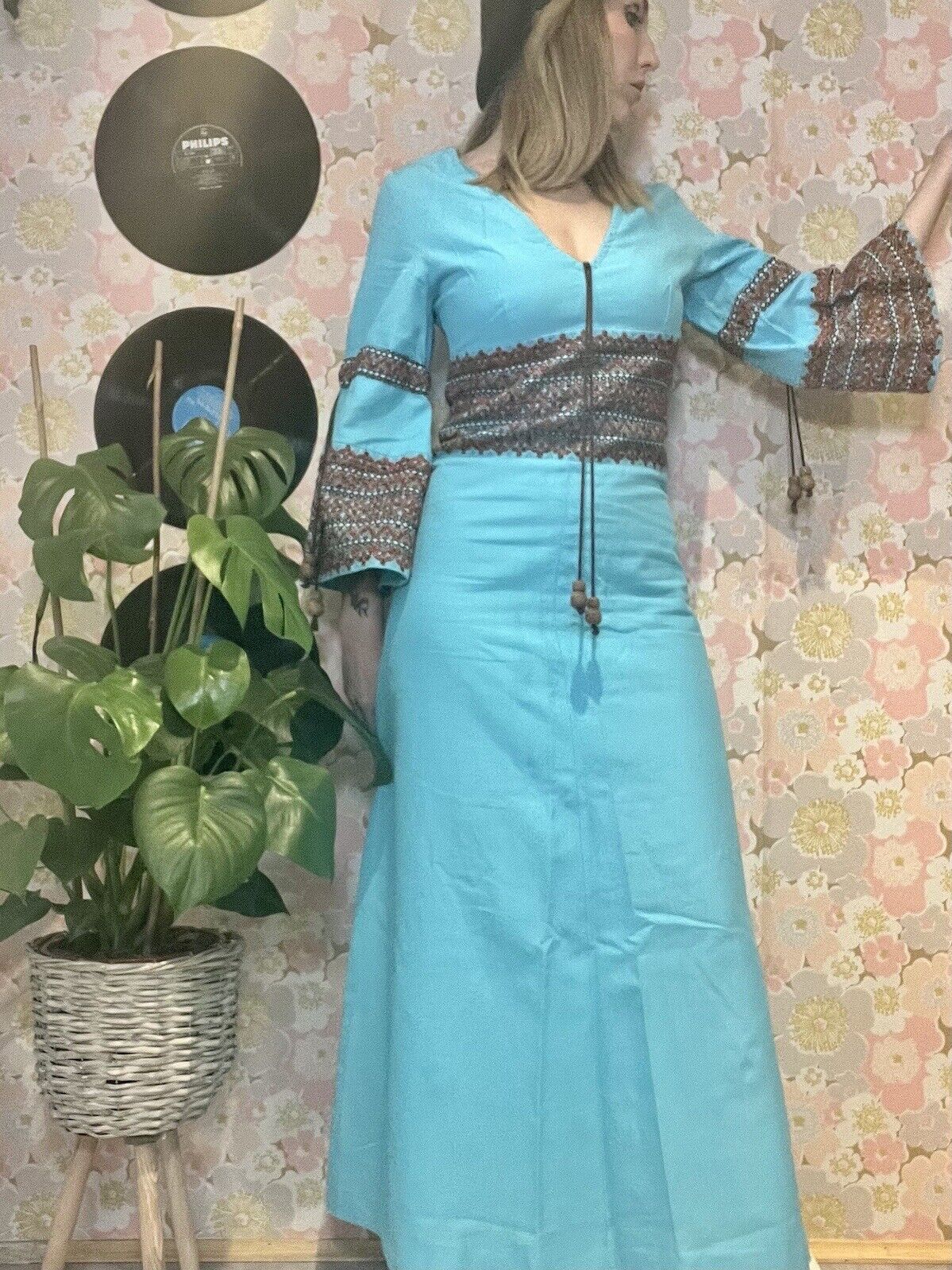 Embrace the bohemian vibe with this vintage Arola maxi dress from the 1970s. With its beautiful bell sleeves and pheasant folk design, it's perfect for any casual or festival occasion. This original piece in a UK size 10 features a stunning light blue hue and is sure to make a statement.