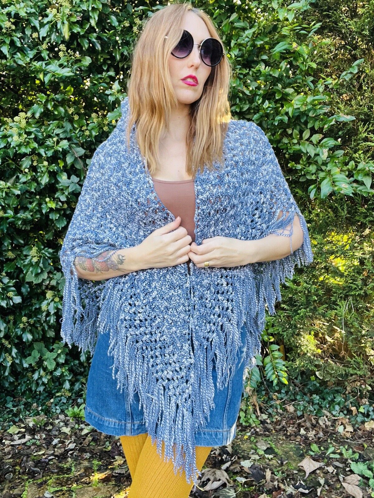 Vintage Boho Crochet Shawl Hippie Triangle Knit Wrap Cape Cottage Whimsy Scarf