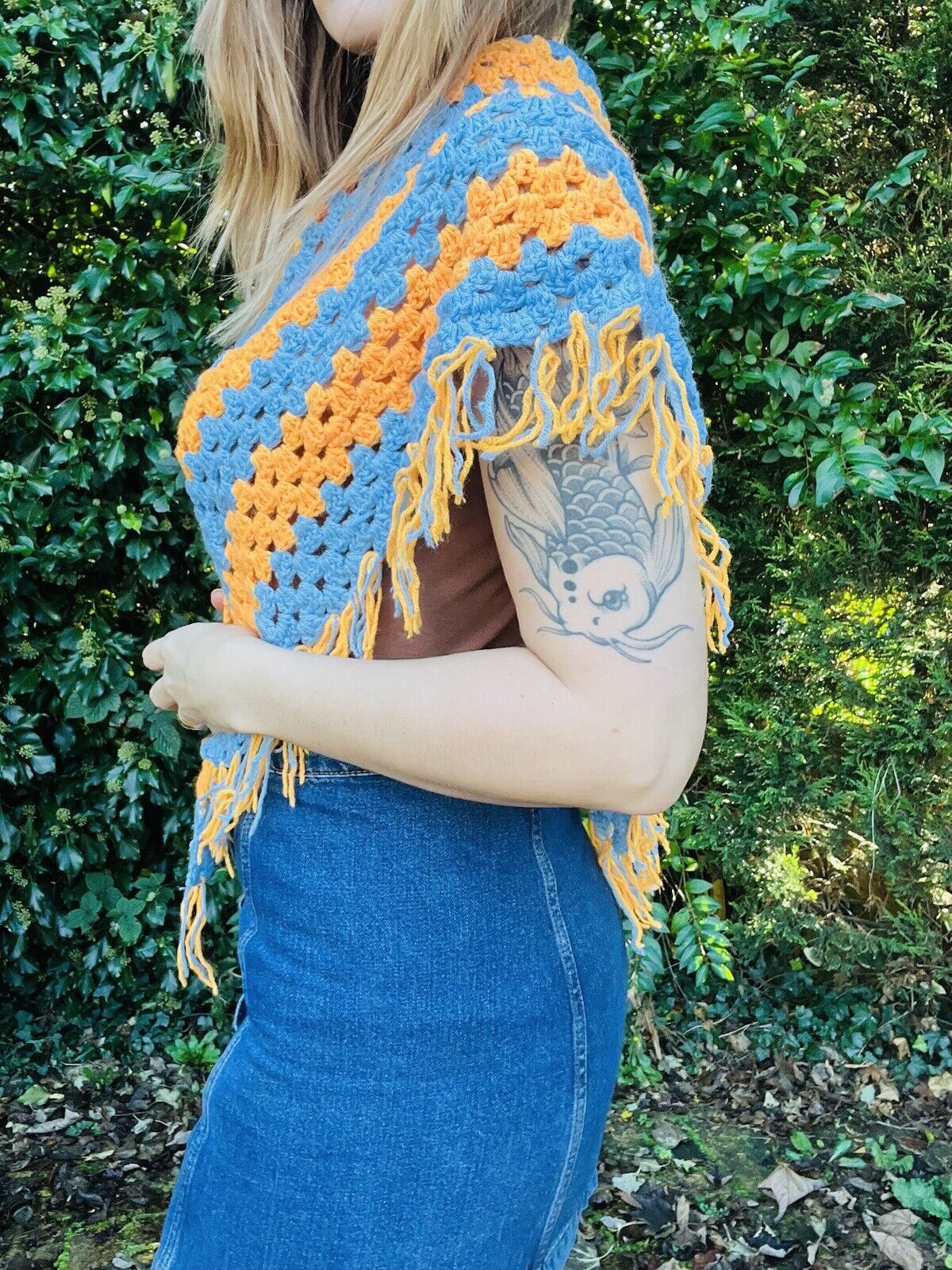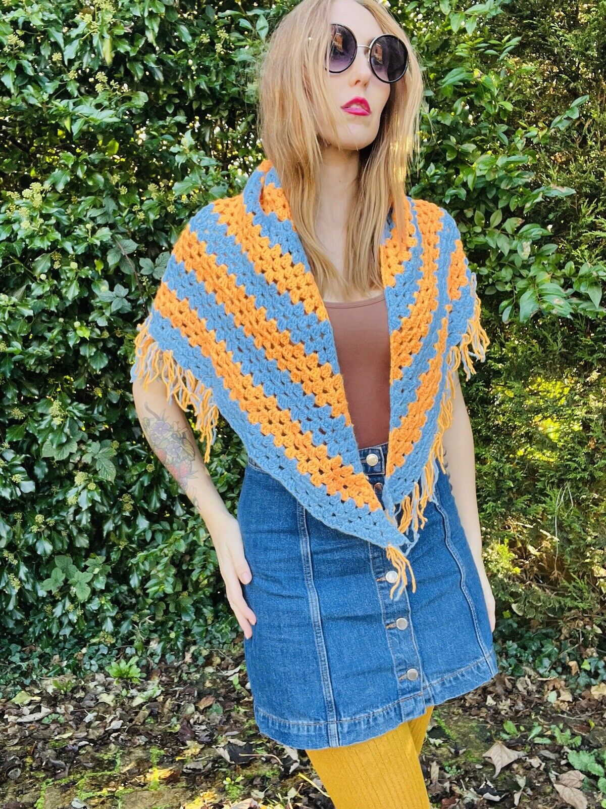 Add some vintage bohemian charm to your outfit with this beautiful crochet shawl that features a triangle shape and is perfect for a hippie look. The shawl is made of a crochet knit material and has a whimsical cottagecore feel to it. This piece is perfect for those who love vintage accessories and want to add a touch of whimsigoth to their wardrobe.The scarf is a great addition to any outfit and can be styled in a variety of ways, making it a versatile accessory. Whether you wear it as a cape, a skirt or wrap it around your shoulders, this vintage crochet shawl is sure to make a statement. It has Stevie Nicks vibes, perfect for a little extra warmth on the cooler winter nights on holiday as a beach cover up or at a festival Get ready to add some boho flair to your look with this beautiful piece.