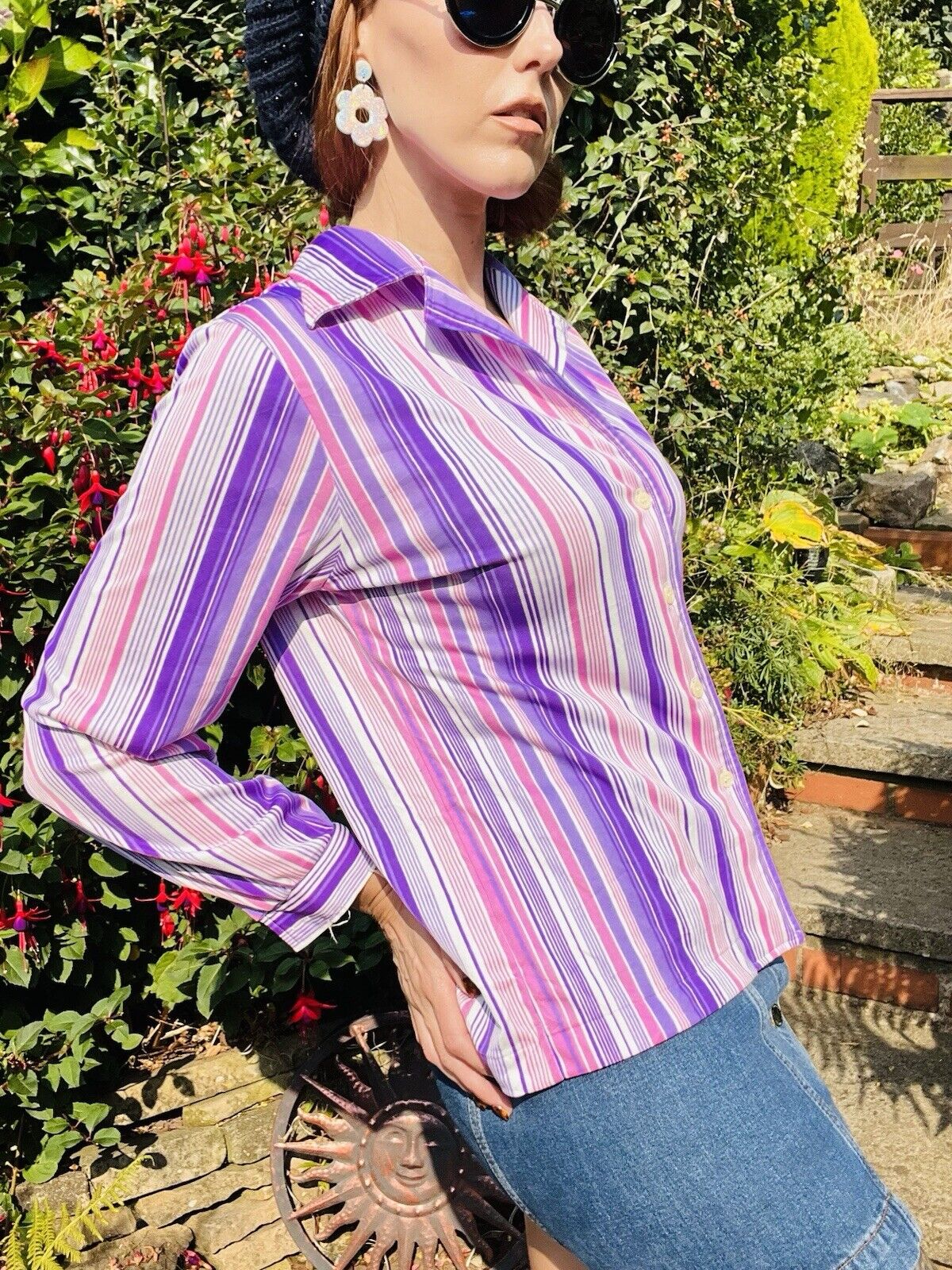 vintage bold striped shirt retro blouse 70s 80s Pink Purple Size 12-14