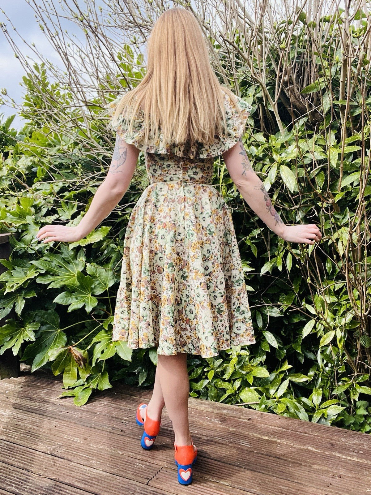 Vintage Floral Summer Dress Bardot Off Shoulder Ruffle Bustier Floaty Midi 6