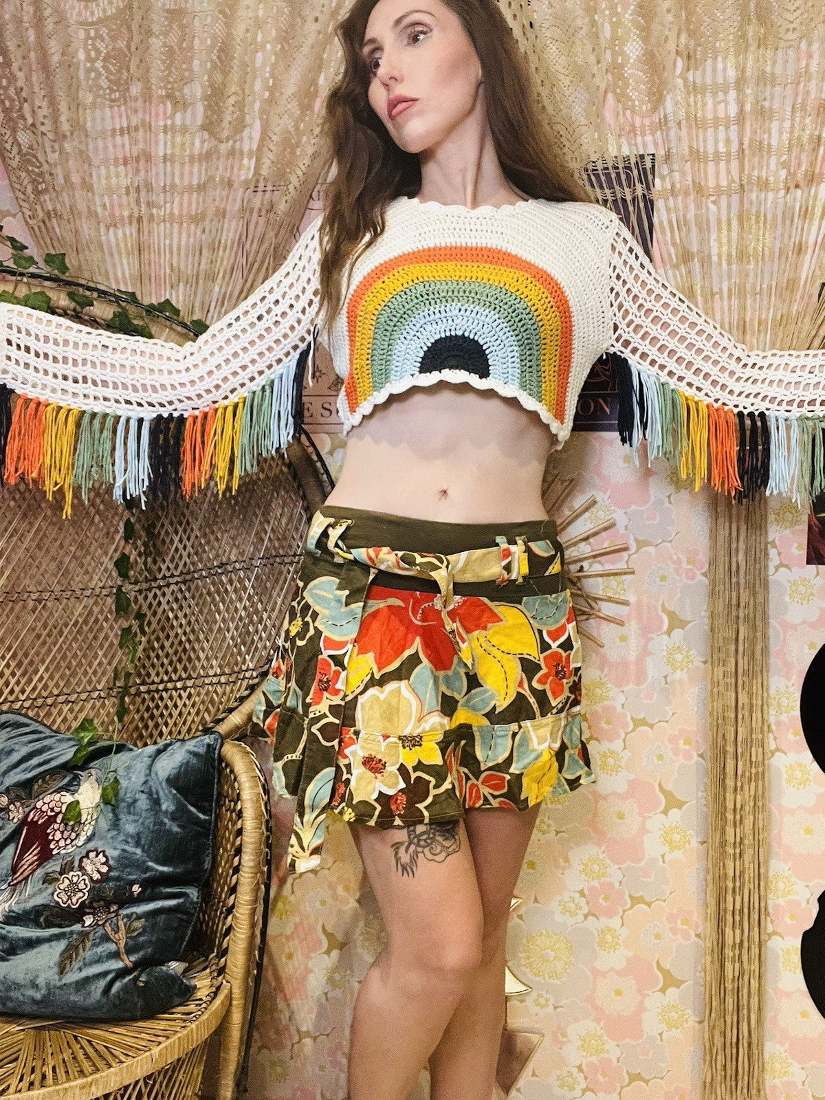 This Vintage Y2K Mini Skirt in a Hawaiian print is perfect for summer festivals or holiday vibes. Made from a comfortable linen and cotton blend material, this short skirt in size 10 features a vibrant multi-coloured design with a tie belt that is sure to make a statement. The brand's Hawaiian theme adds a touch of tropical flair to your outfit, making it a must-have for any fashion-forward woman looking to stand out from the crowd.