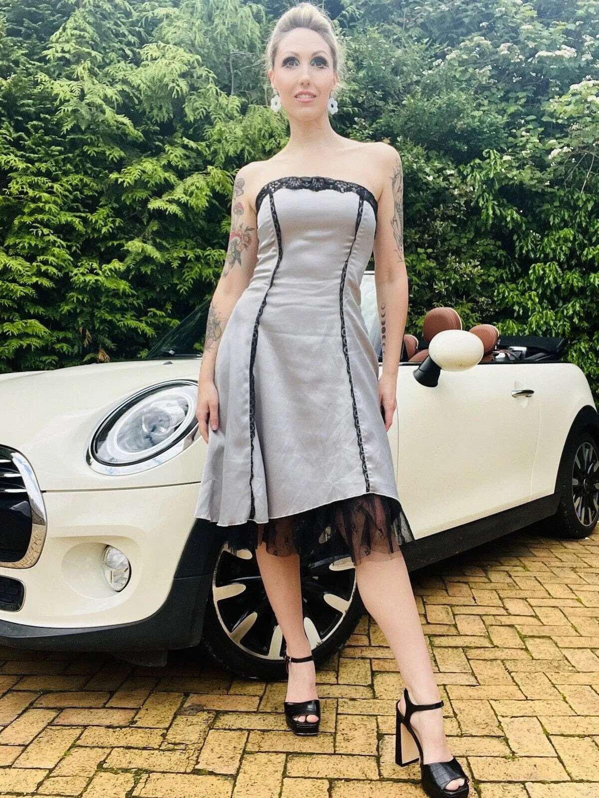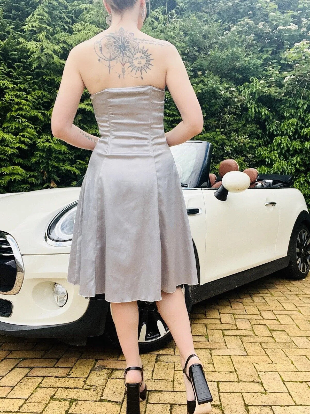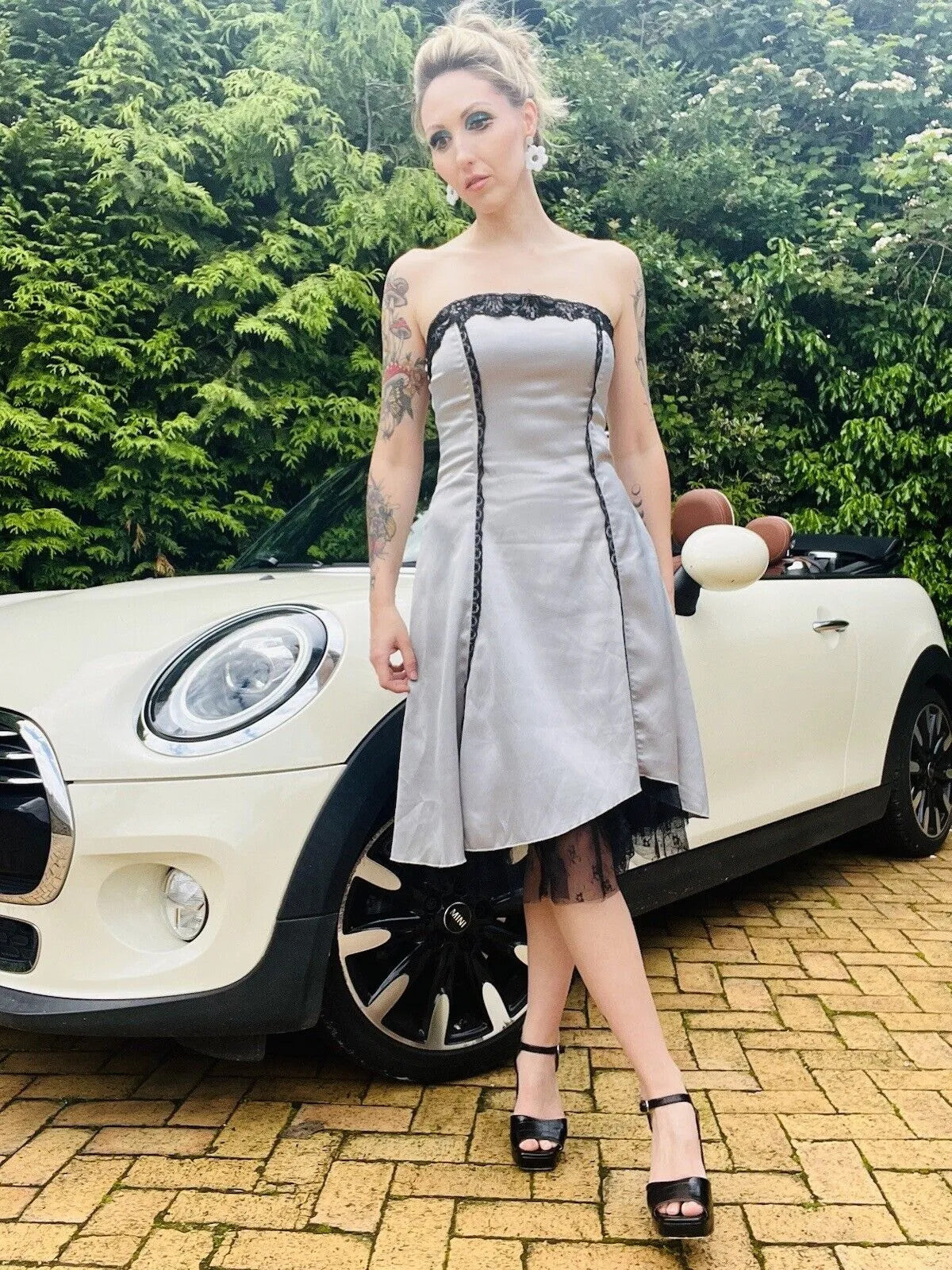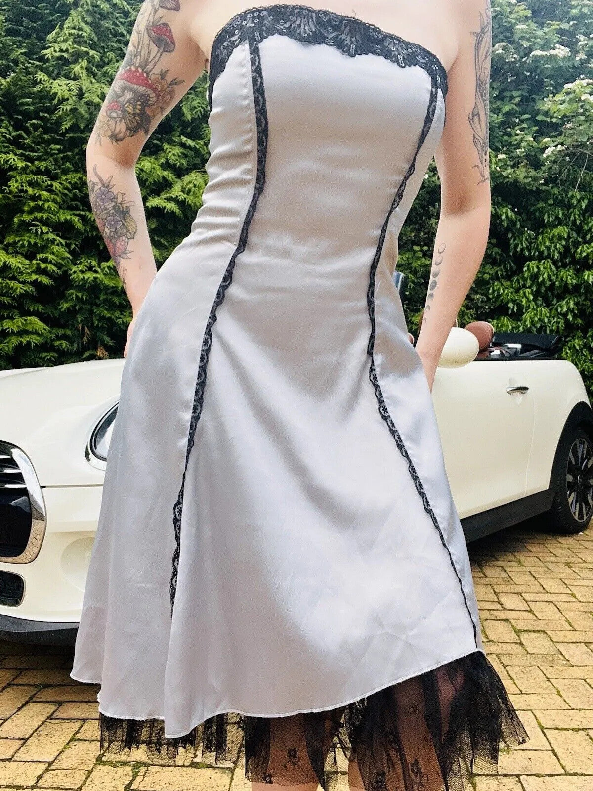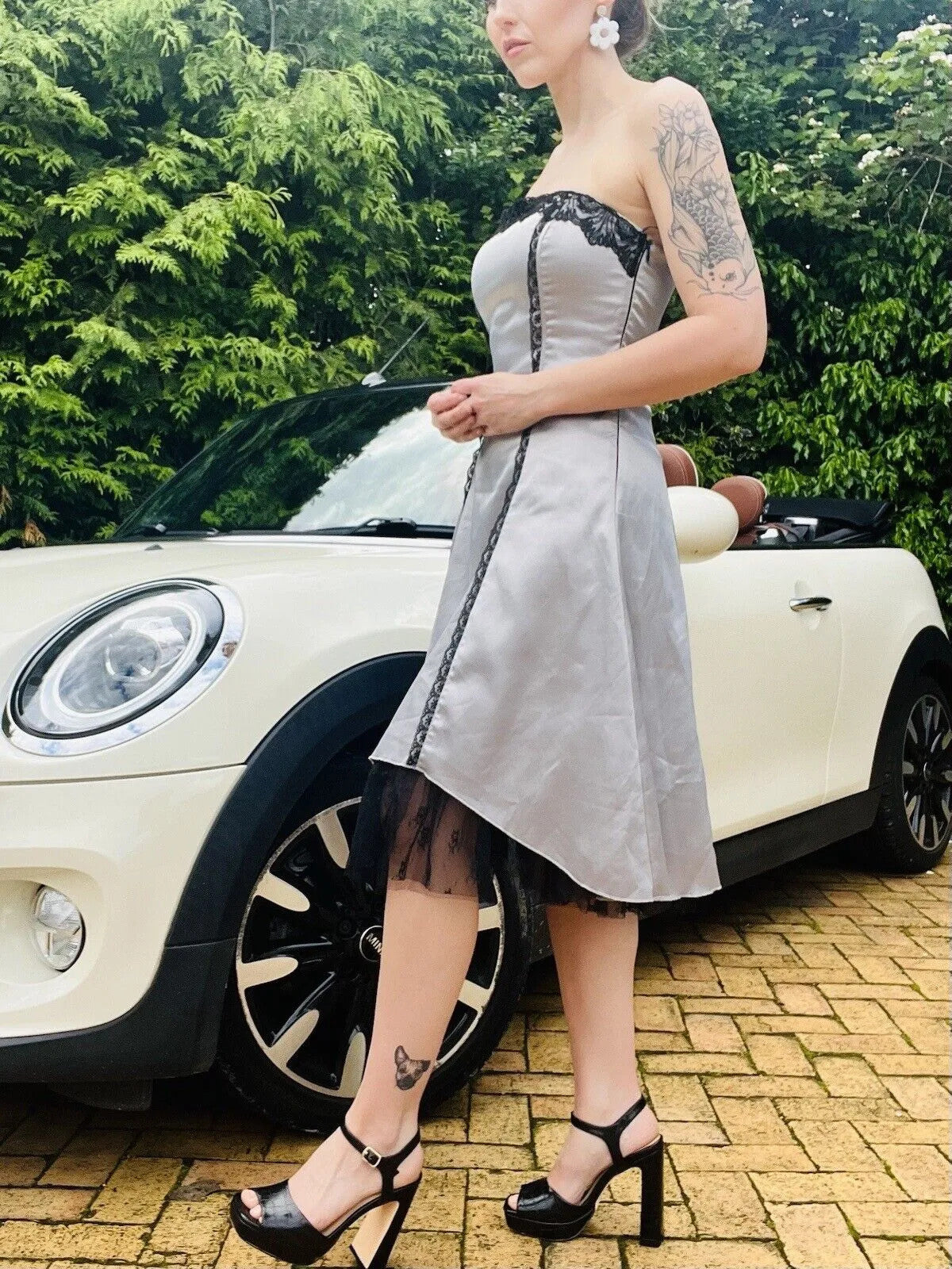 Vintage Y2K party Dress Silver size 10 S By Xanaka strapless With Lace Trim
