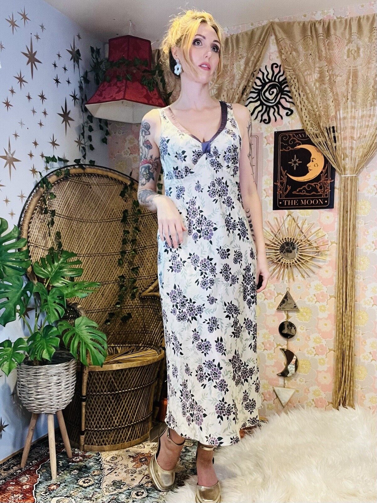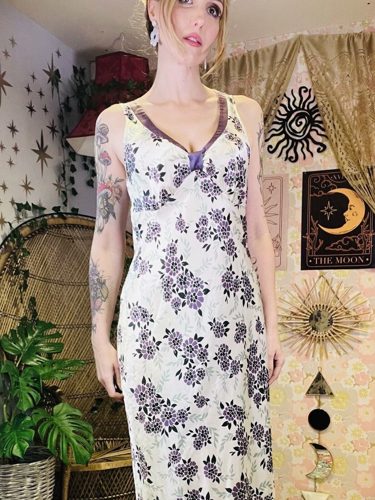 This vintage Y2K slip dress is a stunning piece that will make you feel like a goddess. The dress is made smooth material that gives you a luxurious and silky feel. The dress comes in a beautiful shade of white and purple that will make you stand out in any crowd.